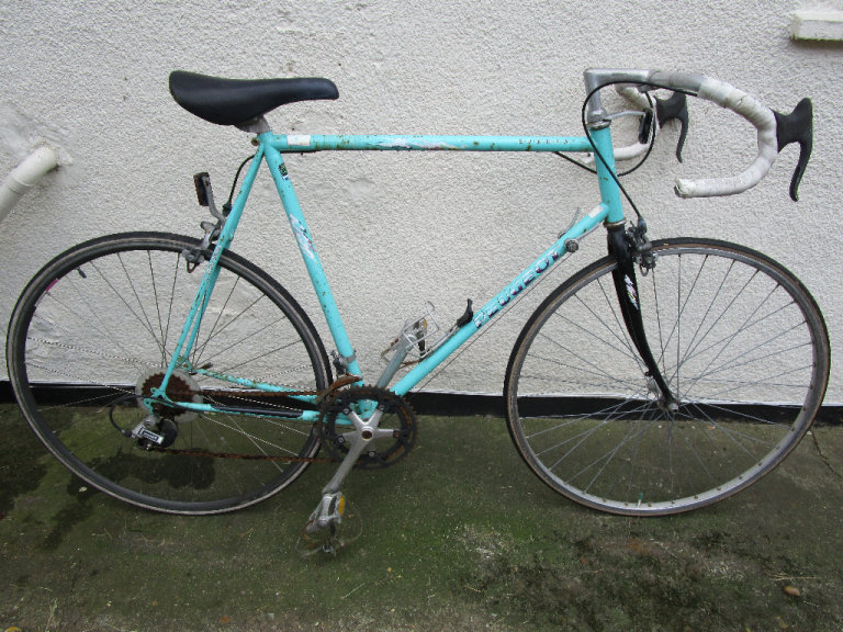 Peugeot Europa racing bike, mint green,drop handlebars, 14 gears, Shimano deraileurs, 700 x 20c tyres, toe clips, bottle holder. In working order.