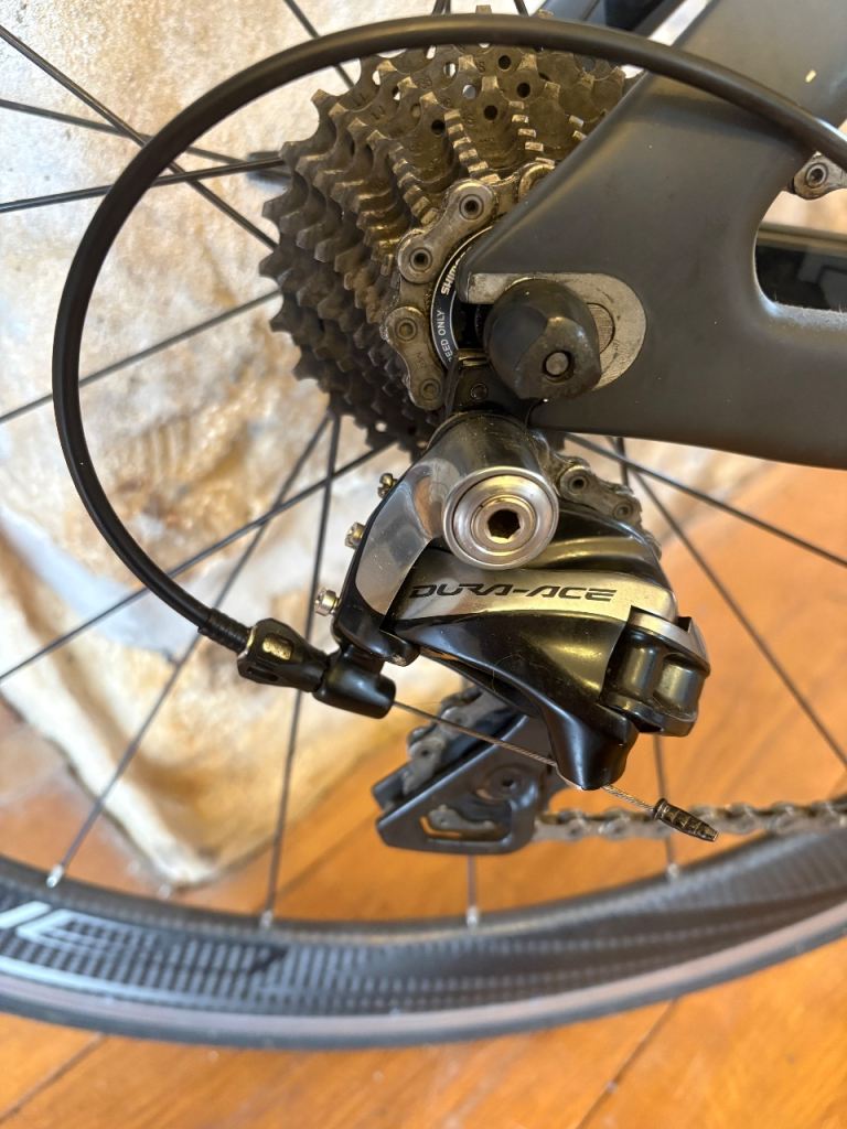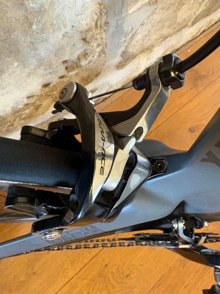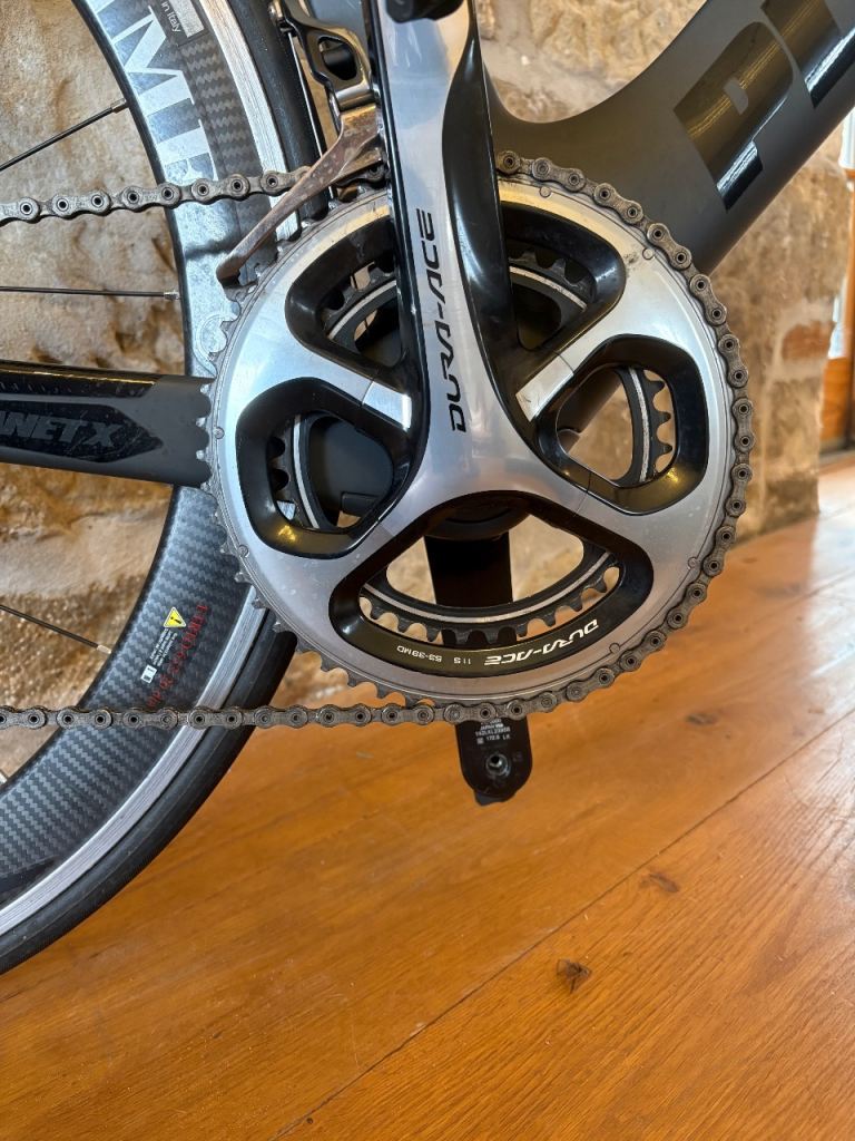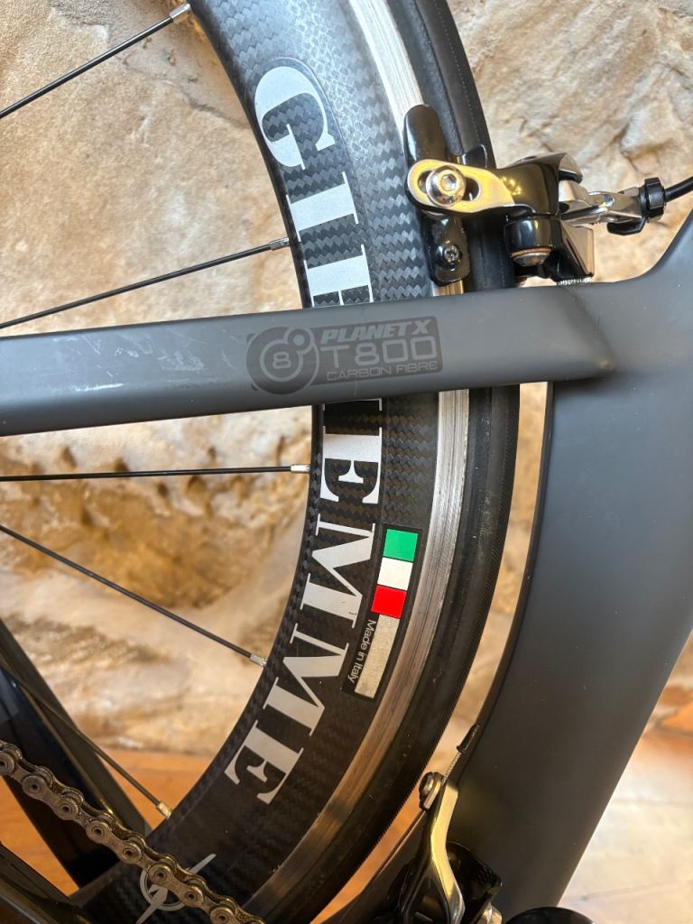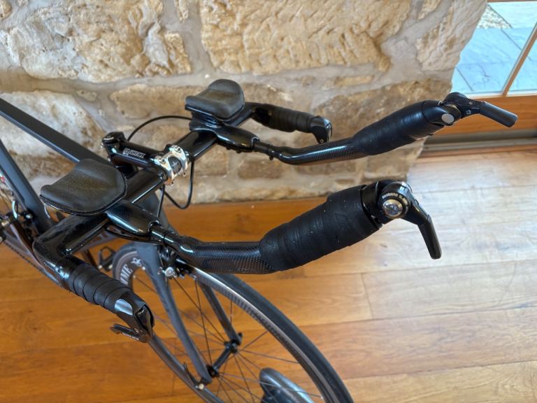 Carbon frame tri bike in great condition, hardly used. Medium size frame. Durace crank set, gears and mechanical breaks. Gipiemme carbon-aluminium wheels . Not used in the last few years, just collecting dust on the gym wall, so best to get a full professional service before use. Price new was £2950, I think! £750 to sell quickly.