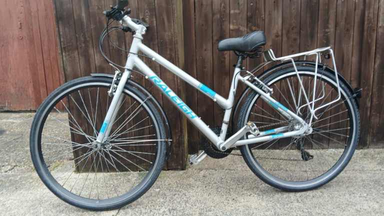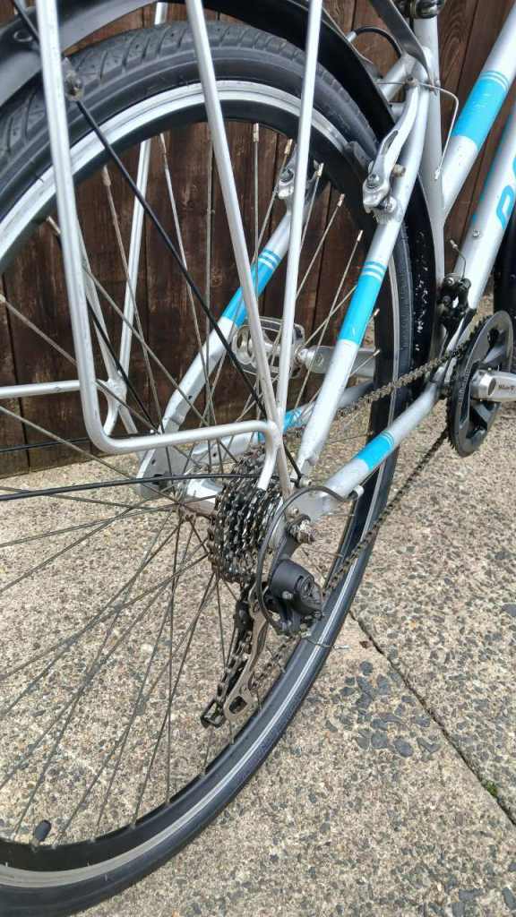 Stunning, comfortable, silver city bike. Perfect for any age, cushioned seat, step-through frame for easy riding, authentic grips for comfort, parcel shelf for luggage, mudguards to keep you clean no matter the weather, quick shift gears, and new 35x27C tyres to top it off