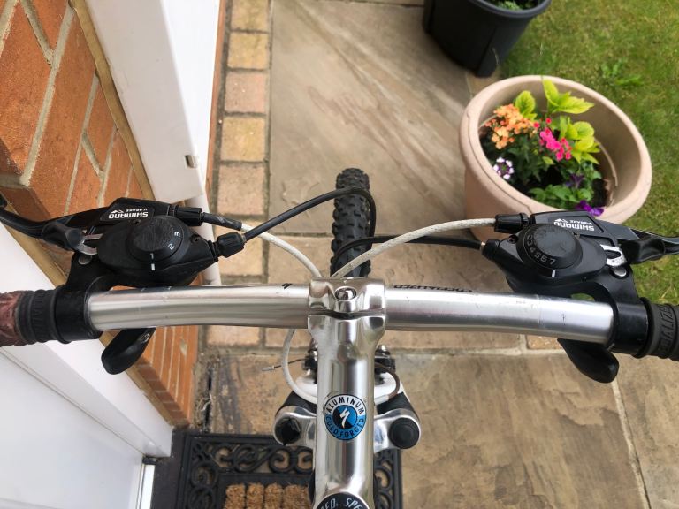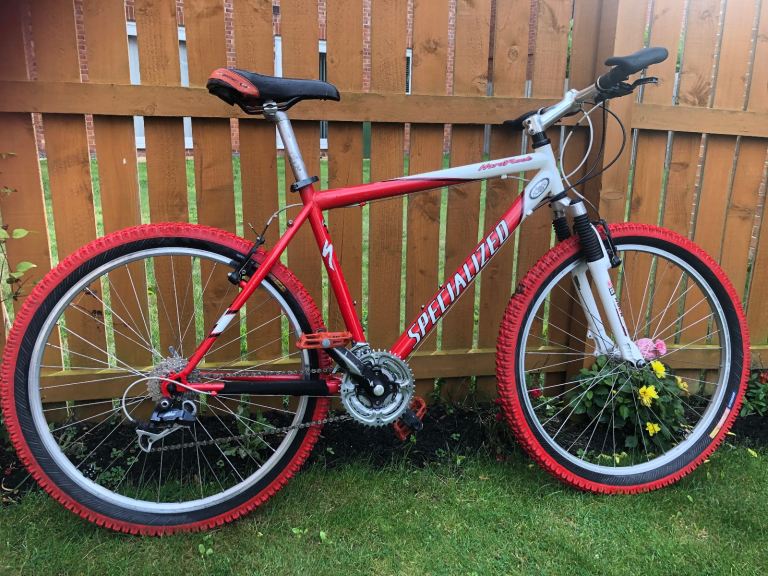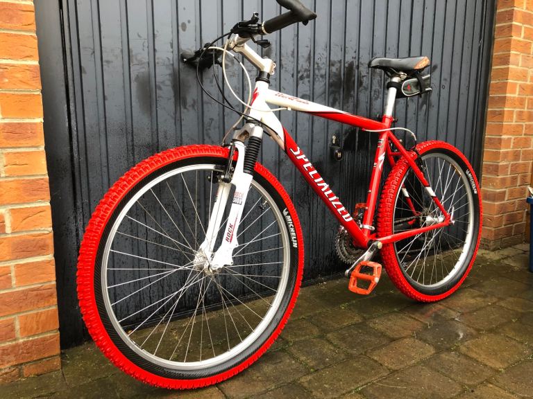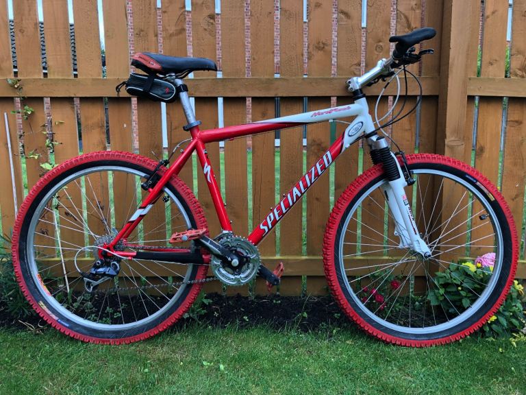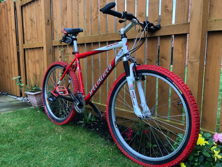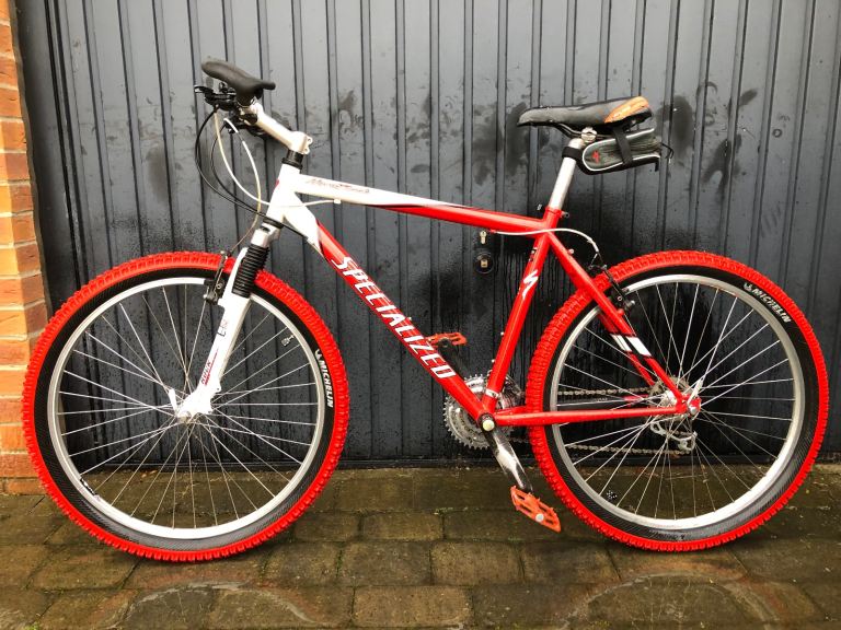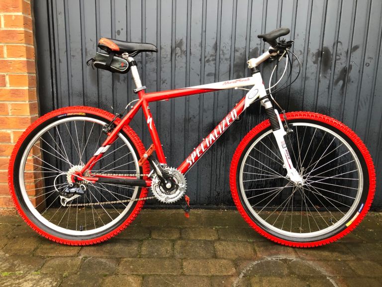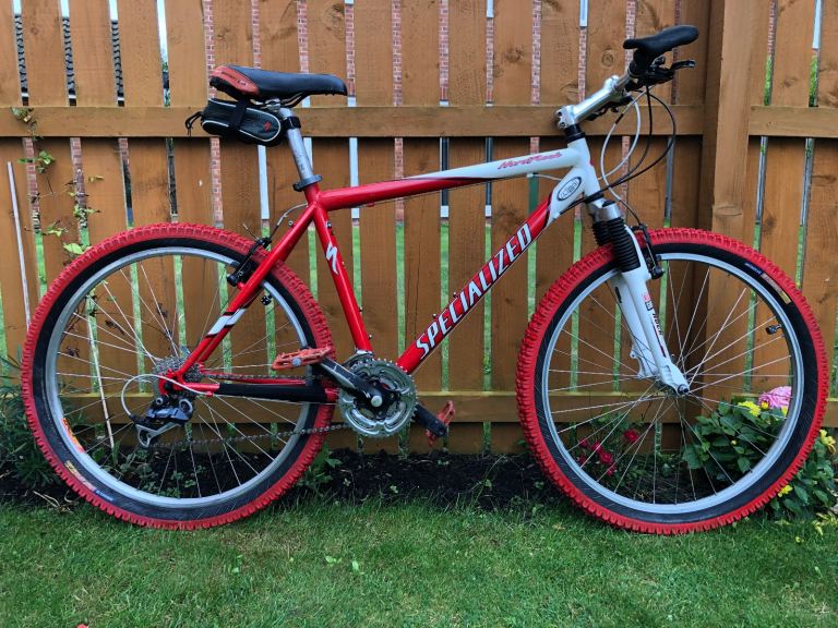 Specialized hardrock , 26” wheels, large 20” frame, shimano lx deore running gear. Rock shox front suspension. Nice chrome/ally original handle bars. 3x7 gear set up so 21 speed, breaks and gears all working as they should, new gear cables just put on with its service. Exceptional retro vintage bike that wil only go up in value. I believe it to be between 1998-2002 age wise. Mint classic. Upgraded Michelin tyres, upgraded dmr red pedals, upgraded grips.