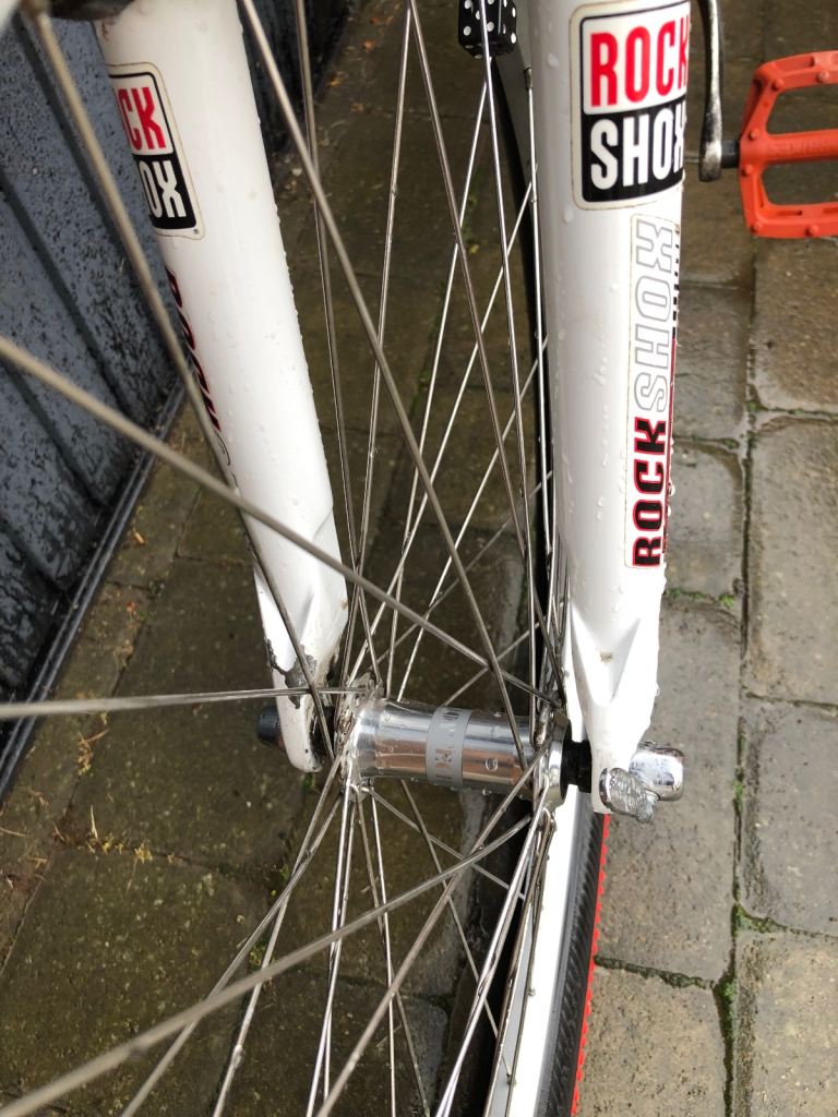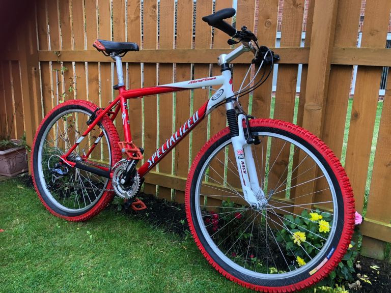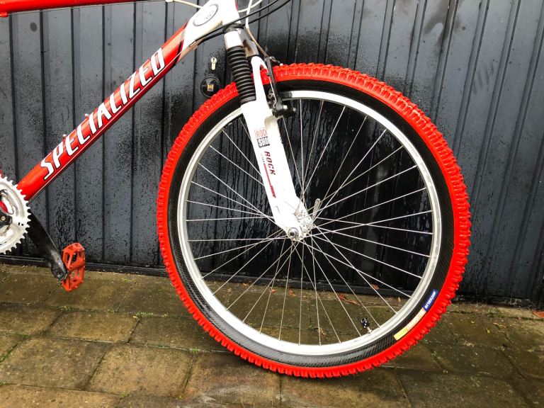 Specialized hardrock , 26” wheels, large 20” frame, shimano lx deore running gear. Rock shox front suspension. Nice chrome/ally original handle bars. 3x7 gear set up so 21 speed, breaks and gears all working as they should, new gear cables just put on with its service. Exceptional retro vintage bike that wil only go up in value. I believe it to be between 1998-2002 age wise. Mint classic. Upgraded red dmr pedals, upgraded ultra rare 26 2.5 Michelin grippers hot s tyres (100 a pair) new grips.