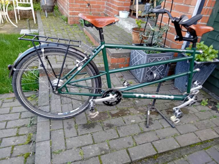 Thorn Raven Discovery. S and S coupling. Able to split bike into one third and two thirds. Once split will fit into car and can take on to train. Panier racks front and rear wheels. Water bottle fitments. Rolhoff 14 speed hub gear. Brooke saddles. British racing green. Stoker frame size 19”. Captain frame size 20”. Much loved bike. Buyer collect.