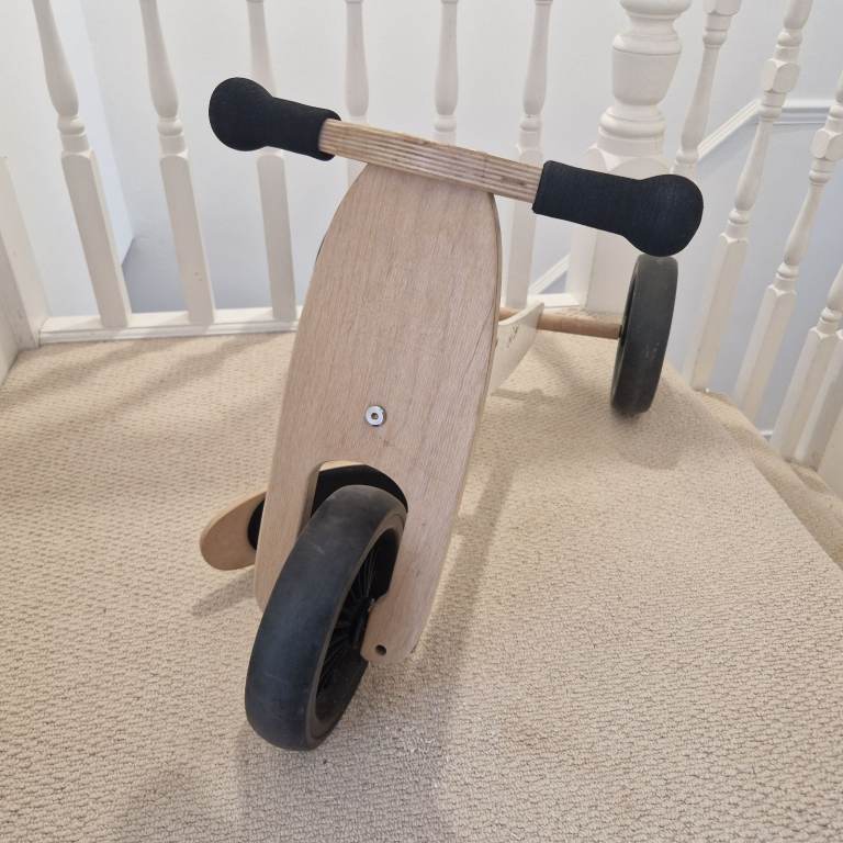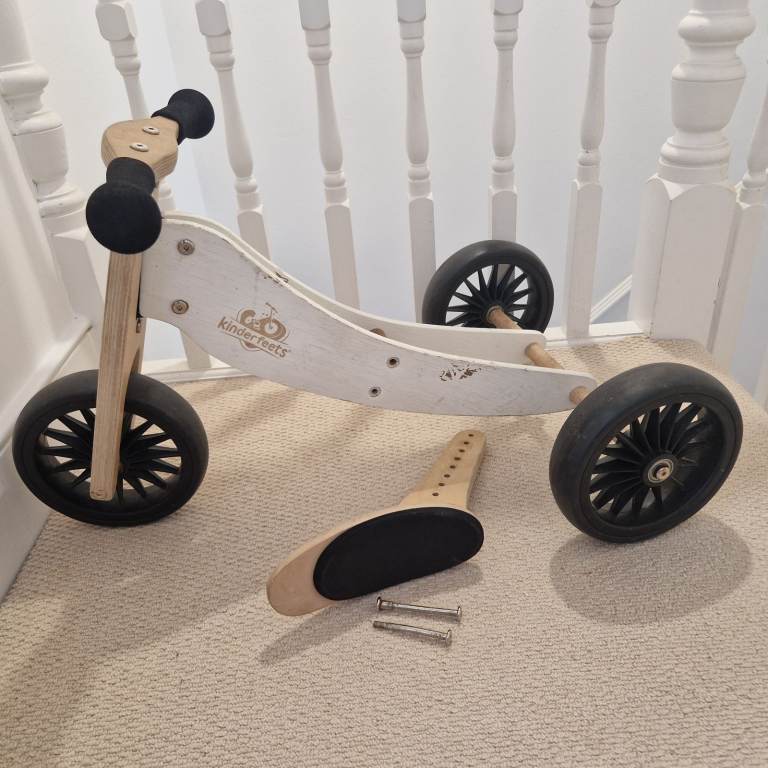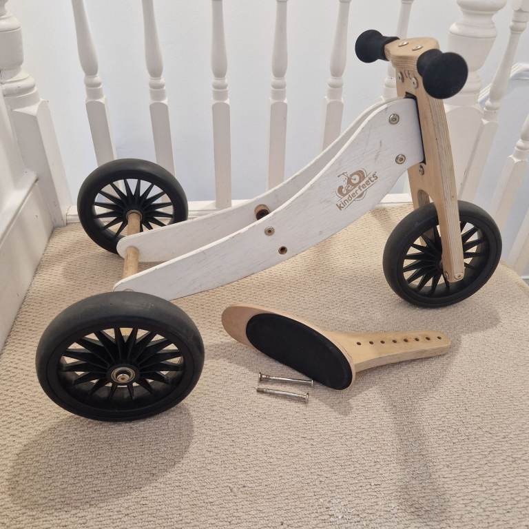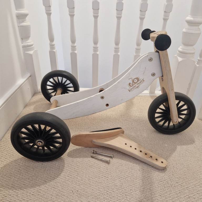 This is a used Kinderfeets Tiny Tot 2-in-1 wooden balance bike and tricycle in cream.