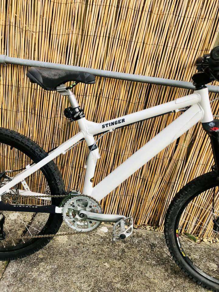 Selling my extremely fun white Club Roost Stinger (dirt jumper) bike with Marzocchi Bomber Boost forks.