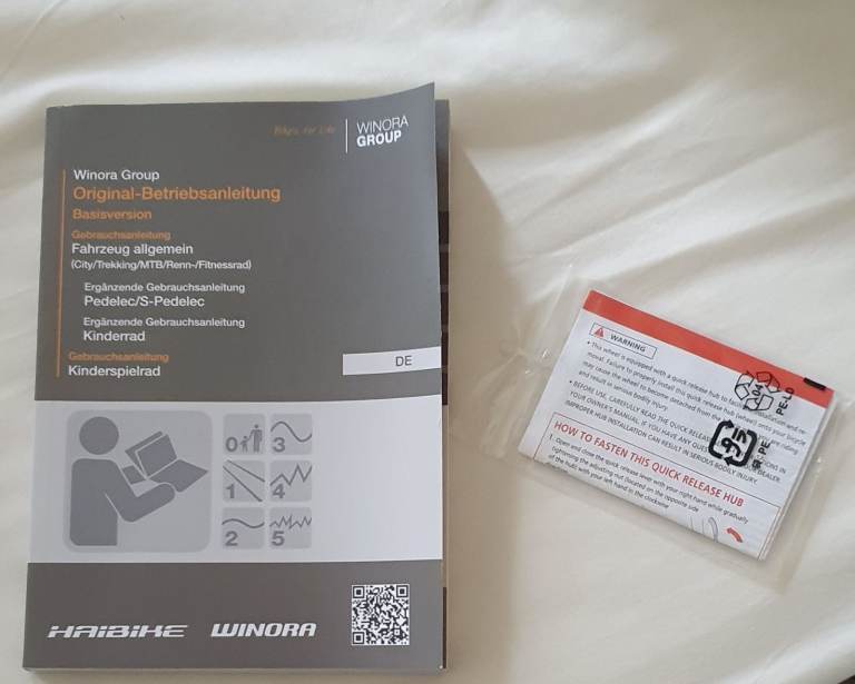 Comes with quick release wheel guide and owners manual, although this is in German. If you scan the QR code on the cover though, an English version is available.