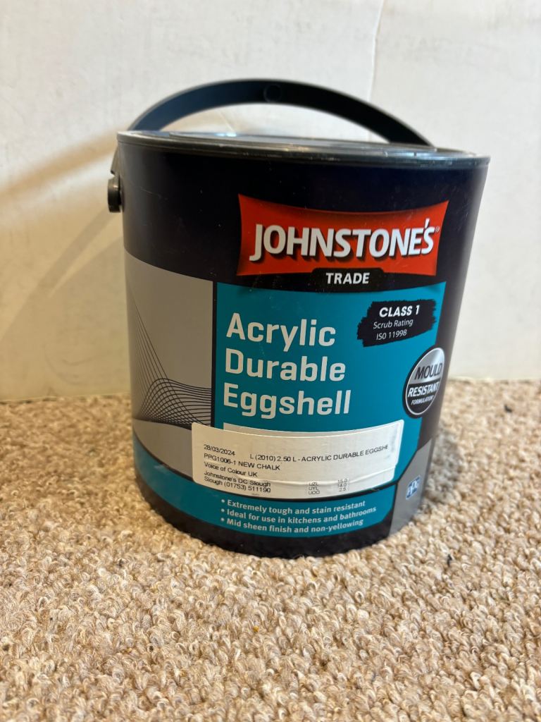 A 2.5 litre tub of acrylic durable eggshell by Johnstones trade
