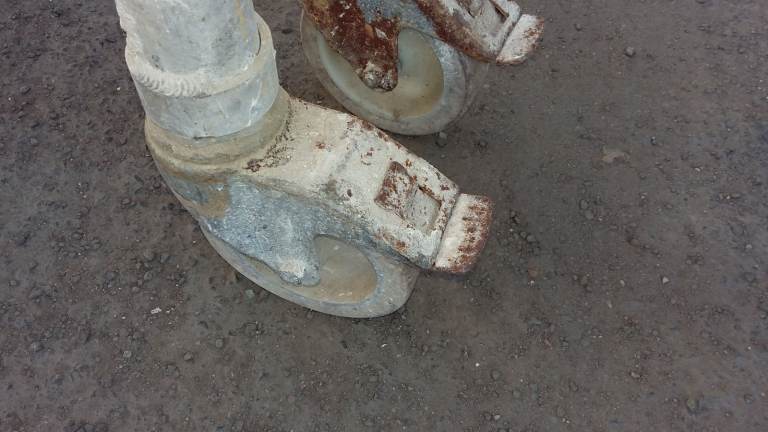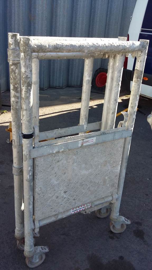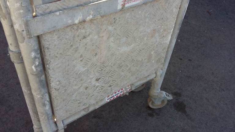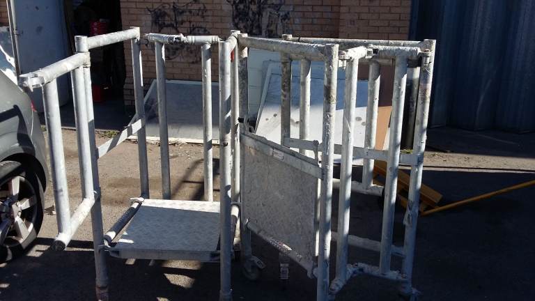 Two aluminium platforms, from the closure of a tile workshop, need cleaning as they are heavily coated with adhesive. They are on lockable swivel wheels, and are in sound condition, with no cracks or dents. Inspection is welcome.