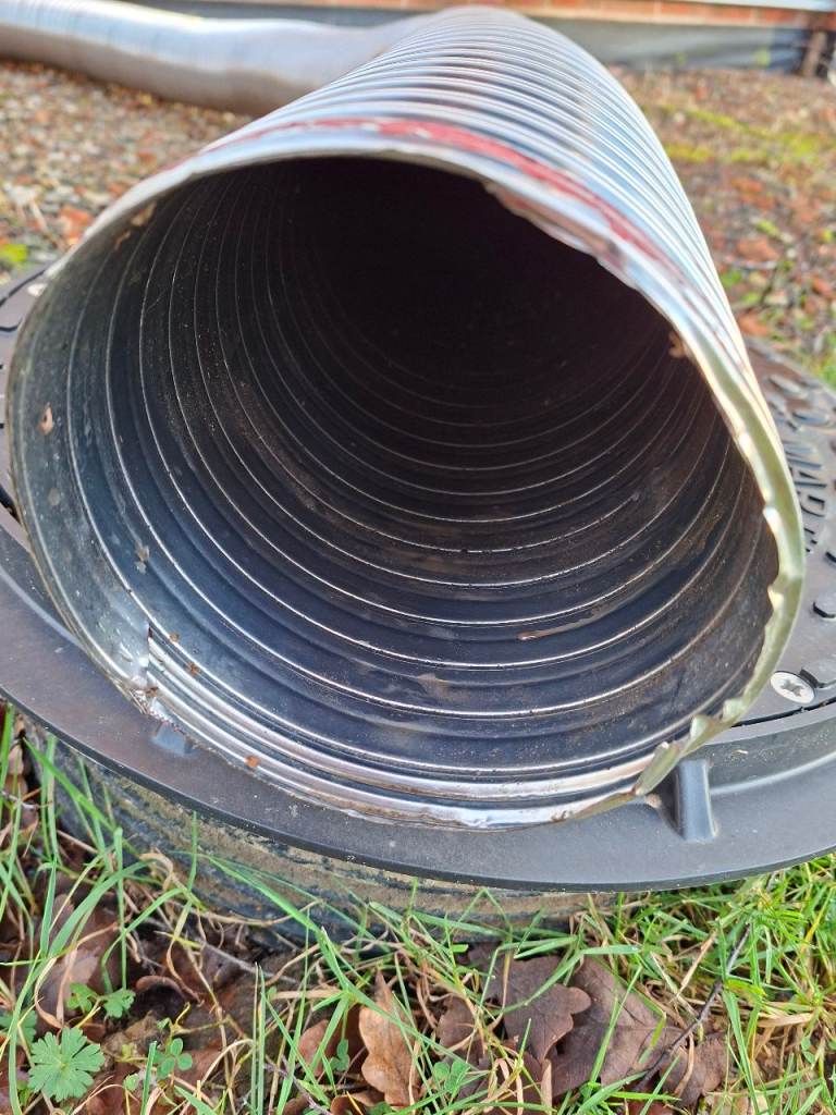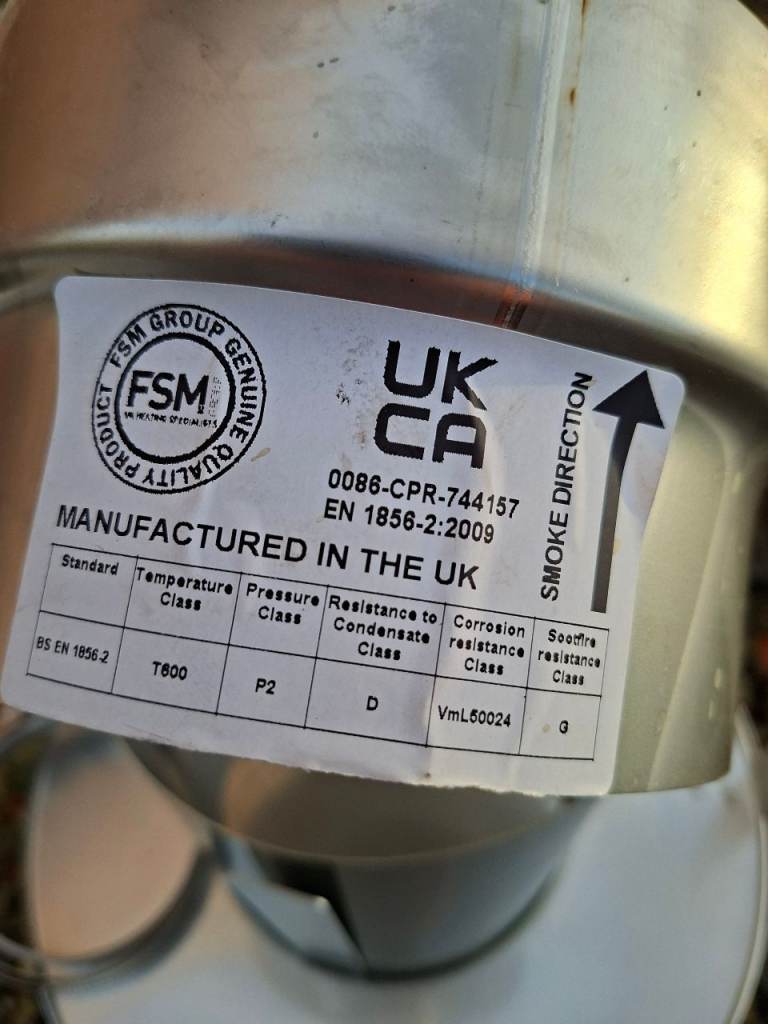 Ultraflex 6 inch 904/904 s/s flue liner for multifuel. 10 metres, top anti-bird cowl, bottom adaptor and pulling cone. Unused and undamaged. Didn't fit our chimney.