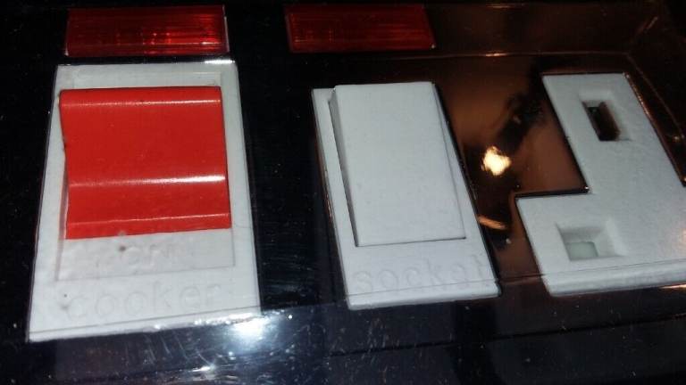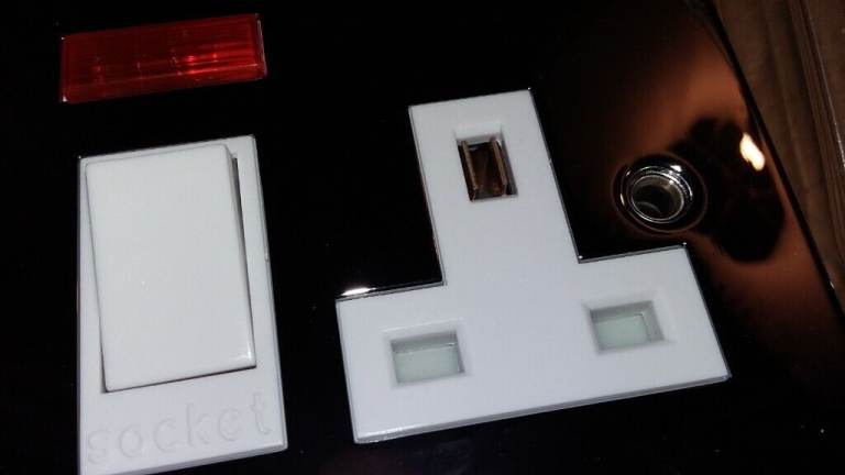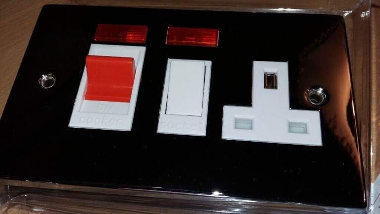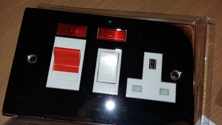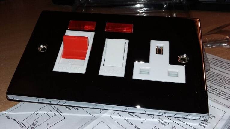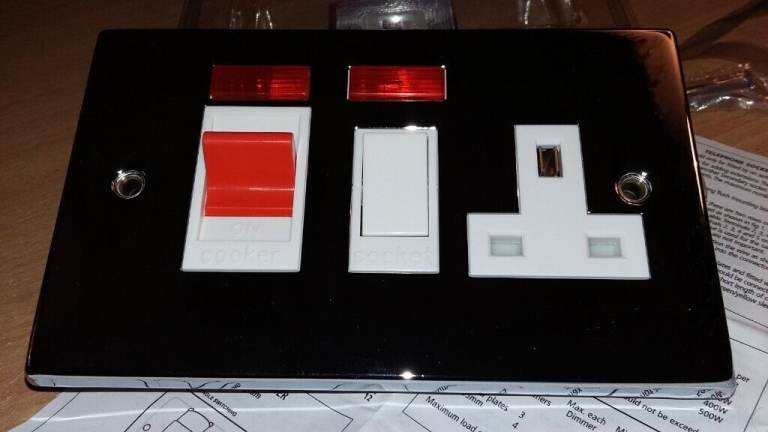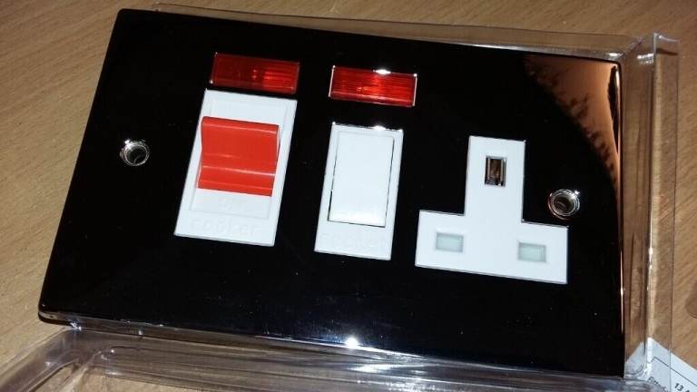 chrome polished finish cooker / 3 pin socket switch, with 2 red illuminated red on-off lights chrome fixing screws included, new and unused, canceled project, from large DIY center, cost ££34.00.00 can deliver Newcastle area or collect from Sandyford ne2 area, also will post to UK destinations for post at cost.