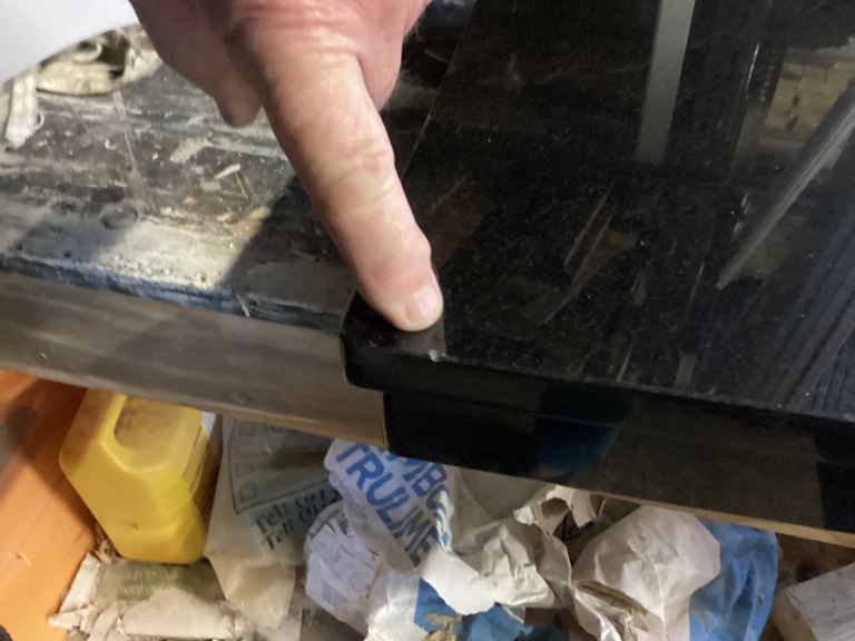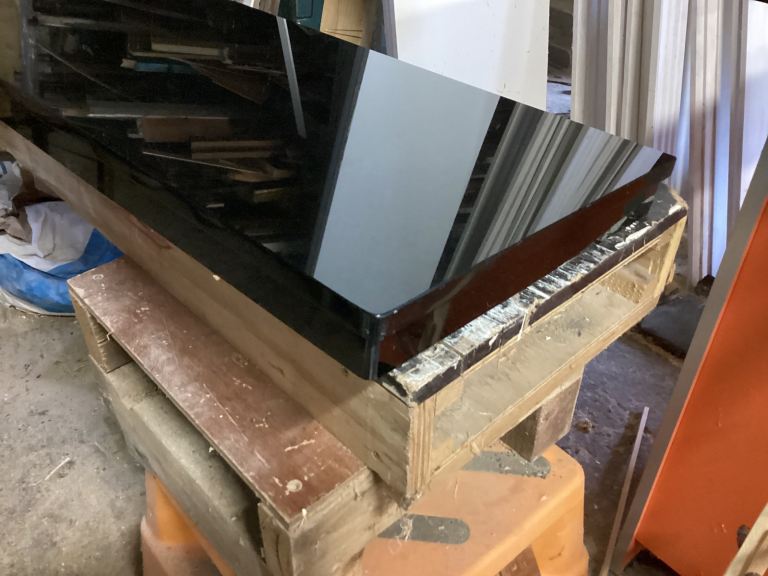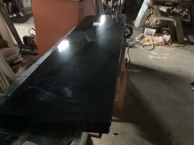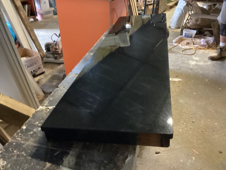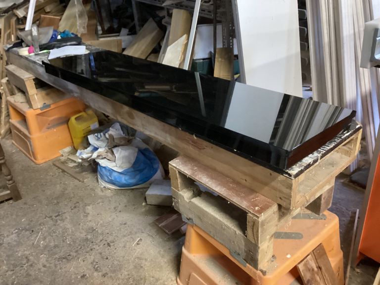 Highly Polished Black Hearth (Composite / Slate / Stone ?) Hearth. Tiny chip on left side, see last photo, 1370mm (54ins) long x 380mm (15ins) wide x 20mm(3/4 ins + plinth
