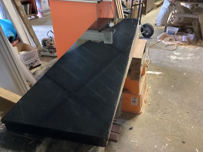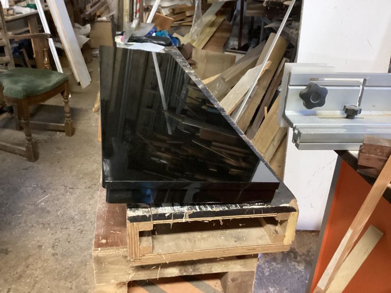 40mm (1 1/2 ins)thick, so overall thickness 60mm (2 3/8 ins) , very good condition ,photos show reflections not marks ! Very heavy. Collection only. £45