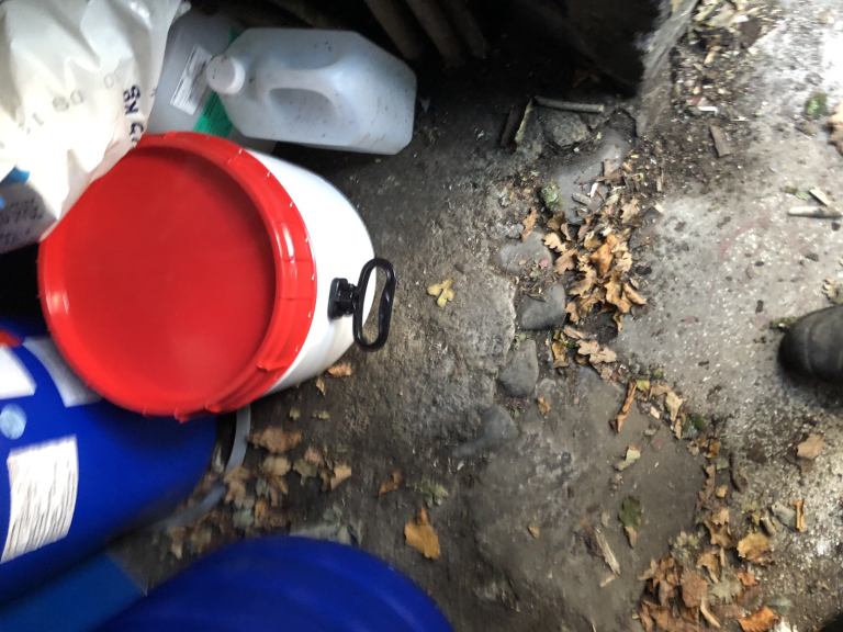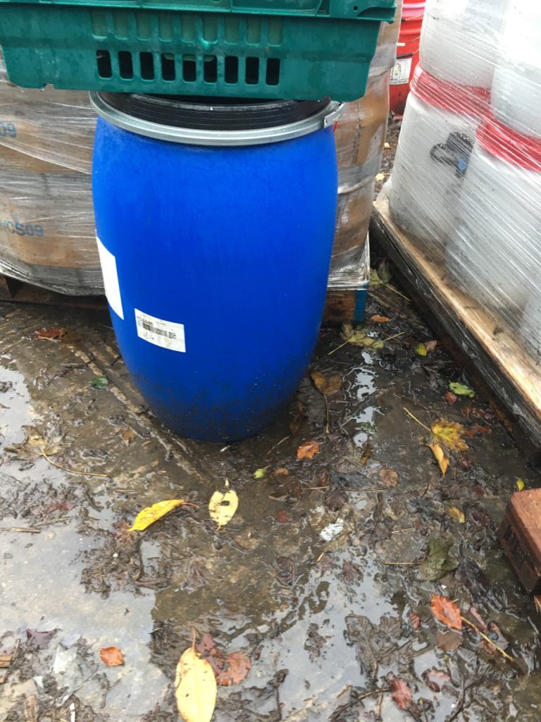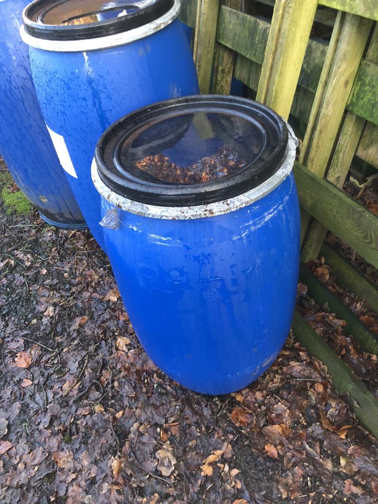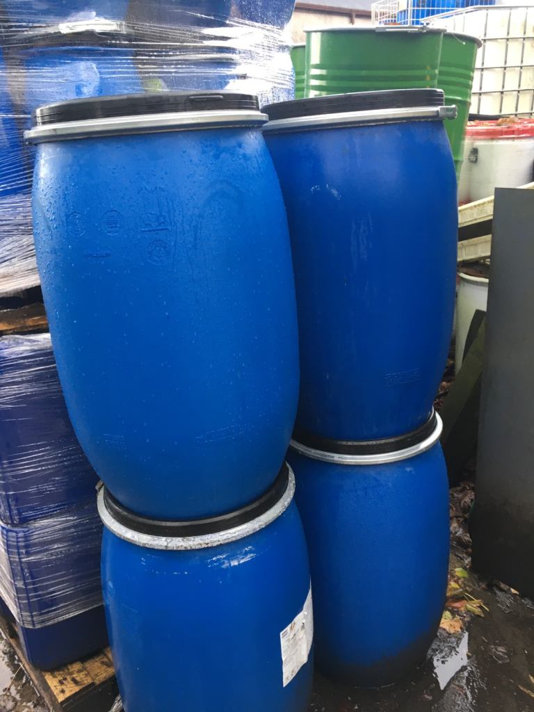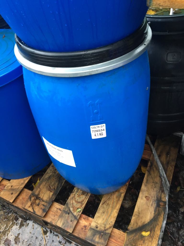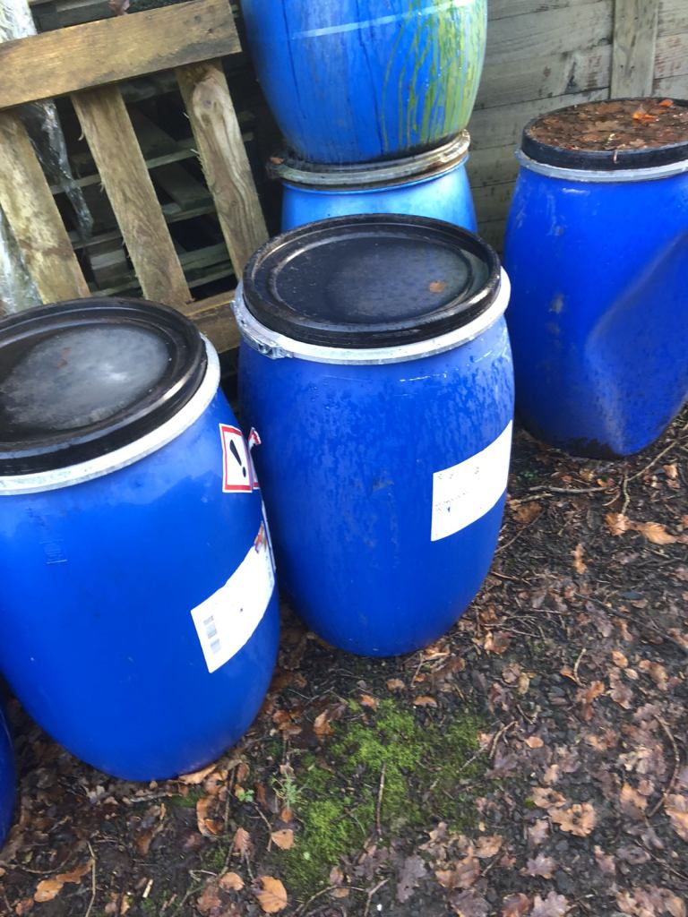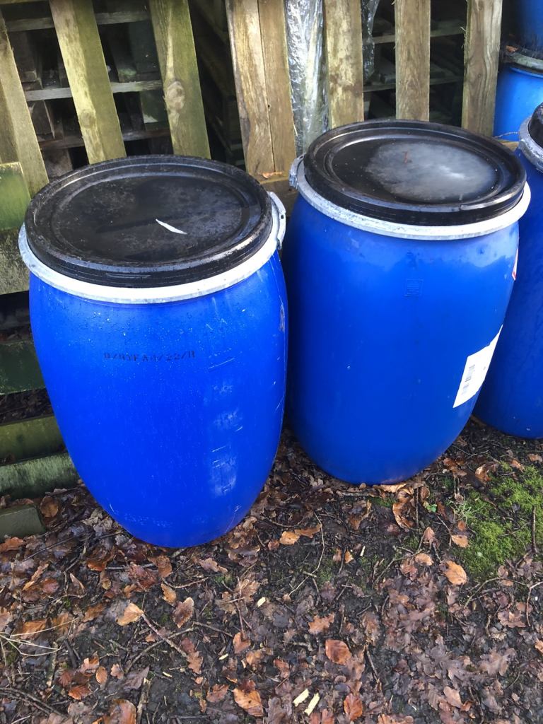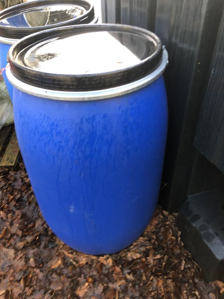 Forsale blue plastic 120 litre barrels complete with a lid and clip band ideal for storage of water or animal food phone for more details