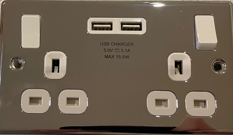 POLISHED CHROME WHITE INSERT DOUBLE SWITCHED SOCKET WITH USB CHARGER USB OUTPUT (FITS 25MM BOX) 5.0V, 3.1A, Max 15.5W I have 17 available at £10 each NEW
