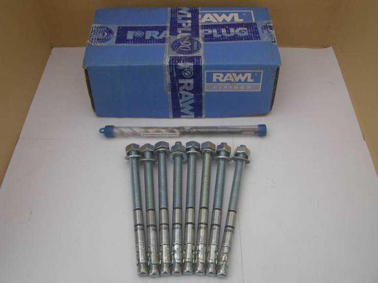 8 of, zine plated, Through-bolts, M12 X 180mm long, plus a SDS Masonry drill bit 12.0mm x 210mm.