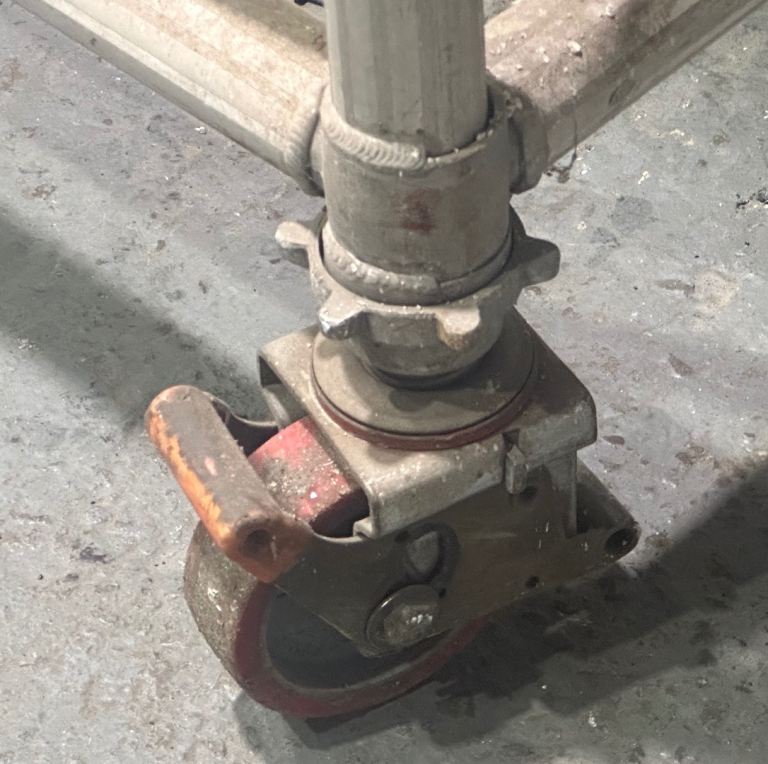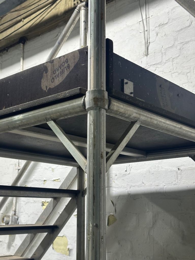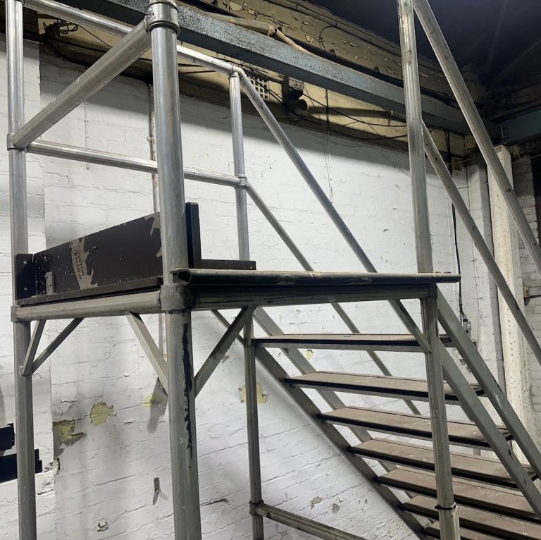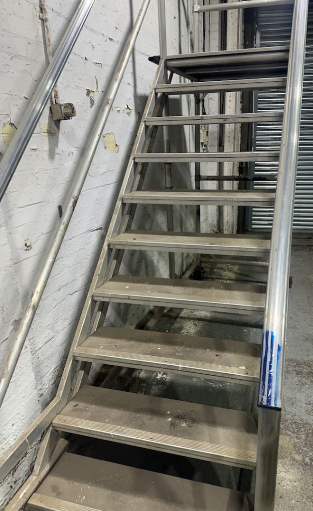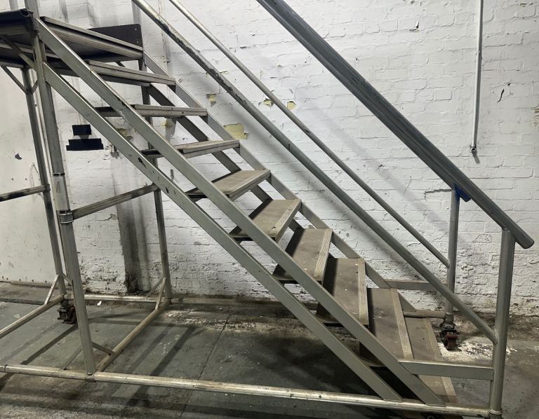 You can hopefully see from the photos how they have been fabricated. The stairs themselves are the same style used on heavy duty scaffolding towers, and there’s a landing area on top. The framework is all aluminium and the treads and platform are made from Buffalo Board phenolic plywood. The castors are very heavy duty and easily lockable. The whole thing has been built and certified by Planet Platforms rather than knocked up in someone's shed.