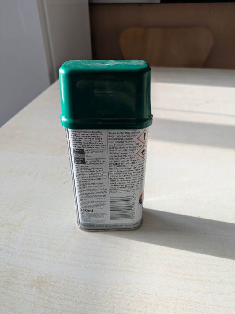 This is the 250ml size High Performance Wet Rot Wood Hardener. The lid has been replaced tightly immediately after use to prevent evaporation.