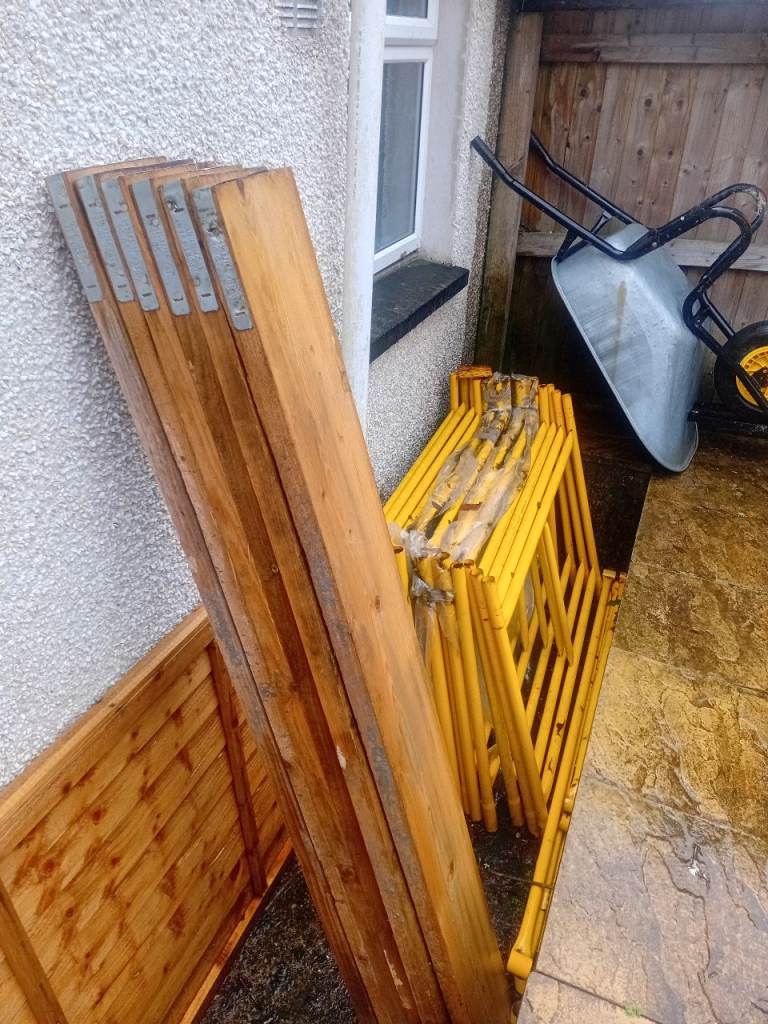 This is as you can see a scafold tower i nought and bords it is form mu memory 7 or 9metrs high i think 9 i still habe a few bundles i have not opend i dont need it any more so selling in grear condision atacable squar feet and attachable wheels with locking