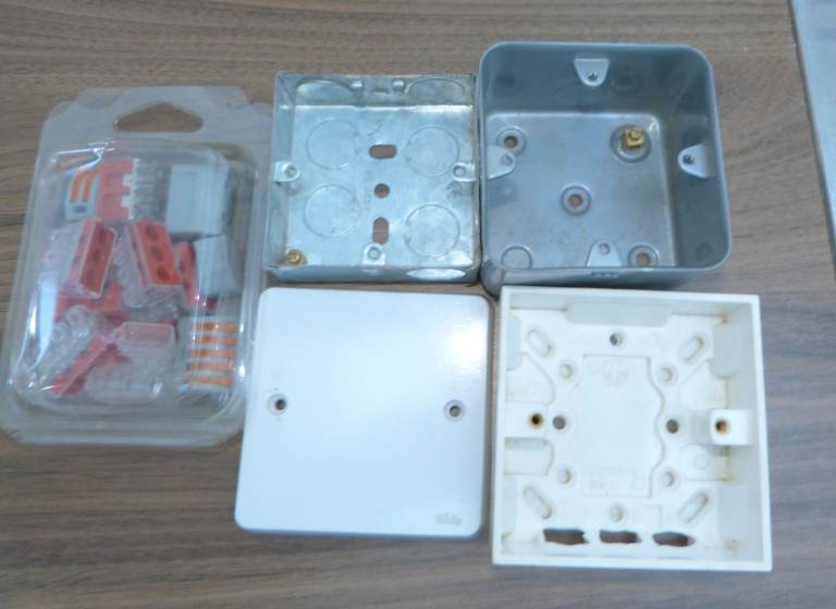 Also included is Hager Junction boxes 2 x J803 & 2 x J501, Hylec in-line junction box, Schneider IP55 junction box, 1 single surfaced mounted metal back box, 1 single metal back box, 1 single plastic surface mounted box (used) 1 single plastic blanking plate, 1 to 2 convertor switched socket, various terminal blocks and cable connectors and a continuity tester (untested)