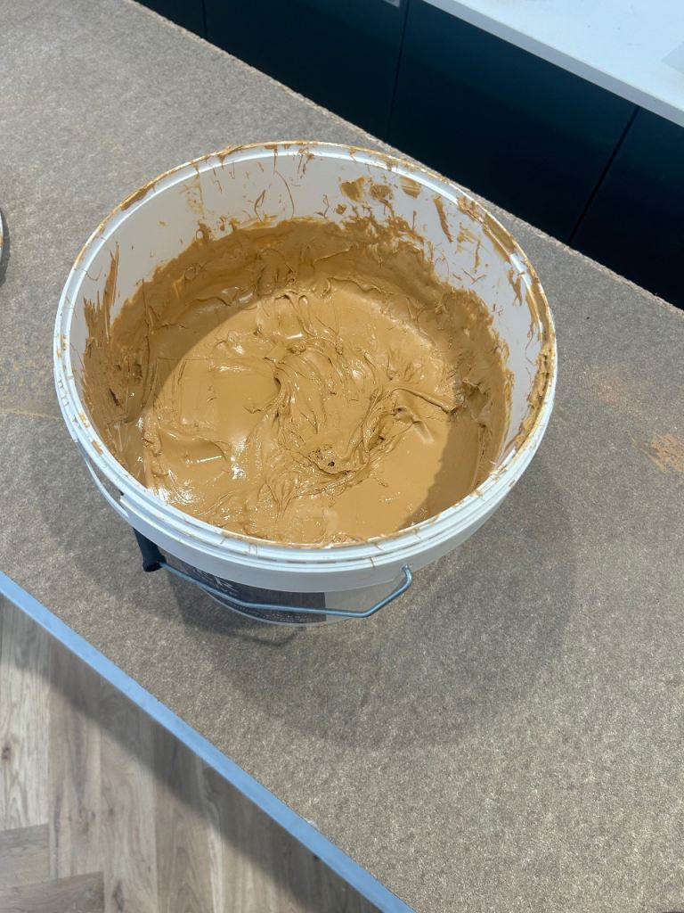 An opened tub of rewmar MS ploymer flooring adhesive that is 2/3rds full, enough to approx cover 10m2 of flooring.