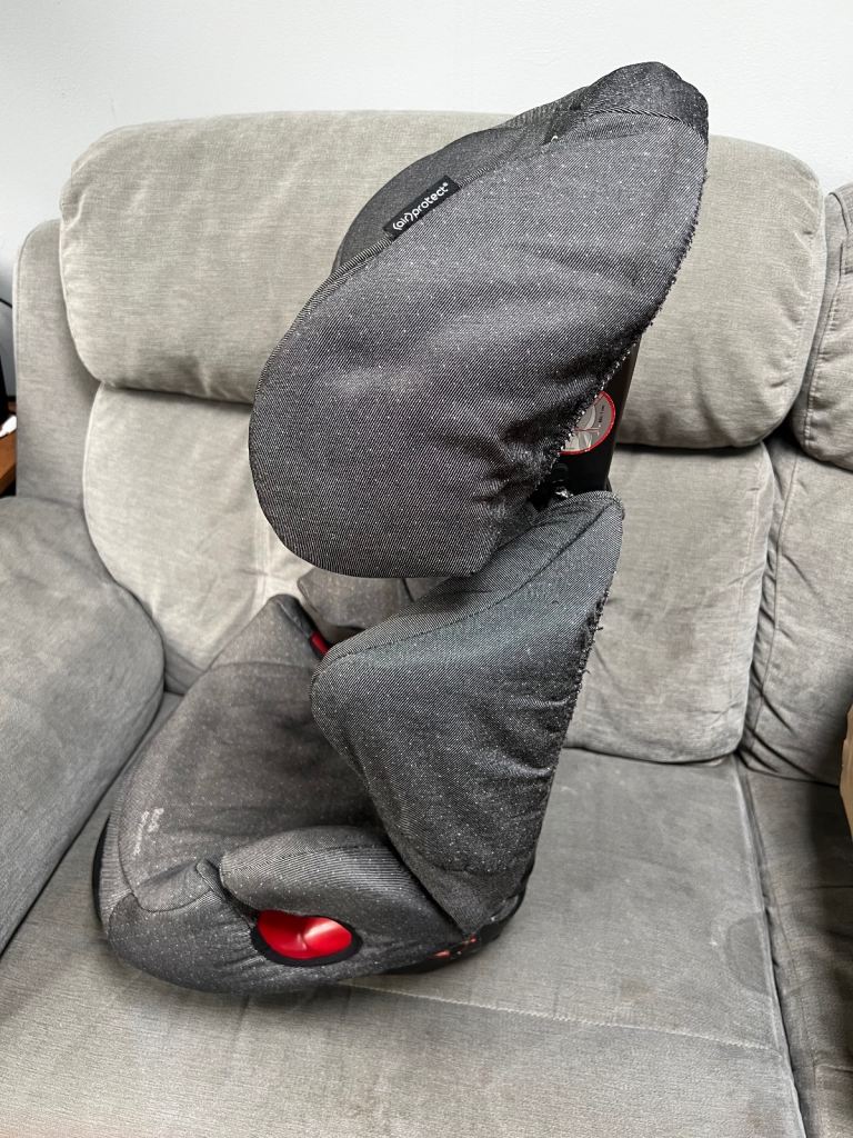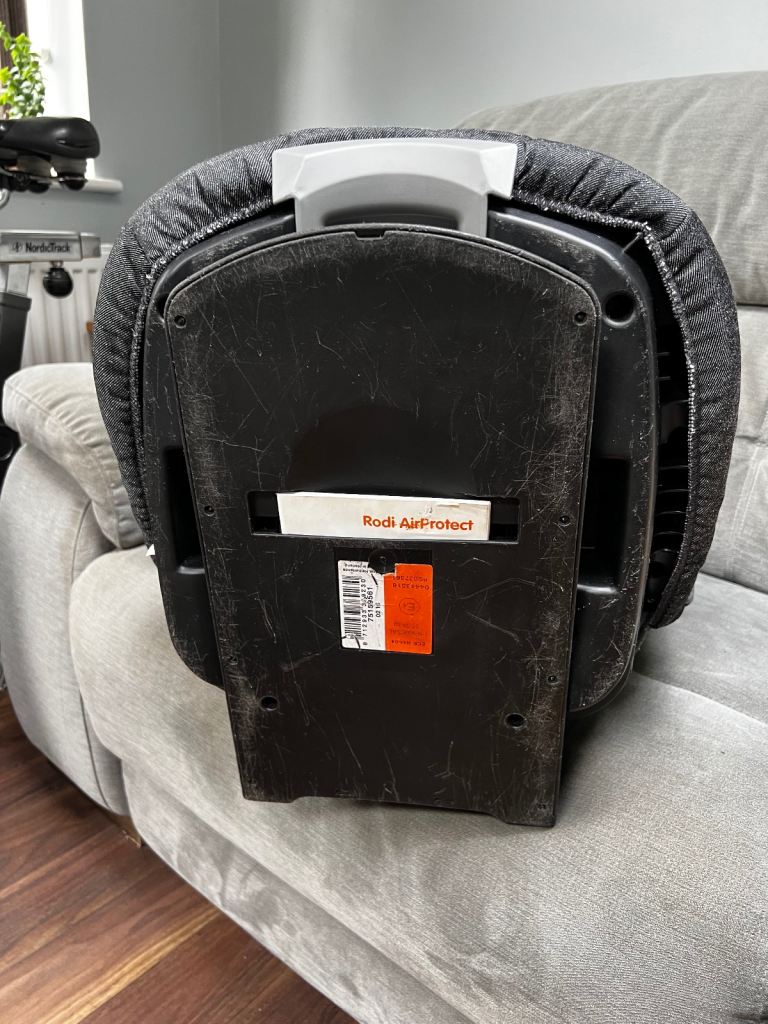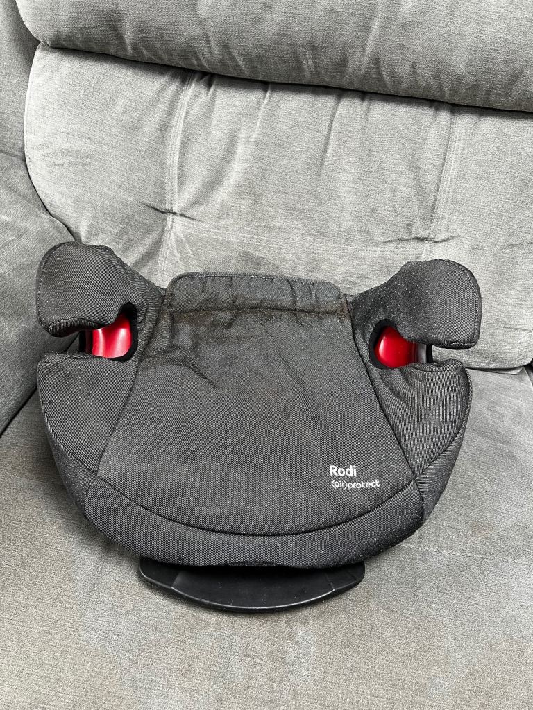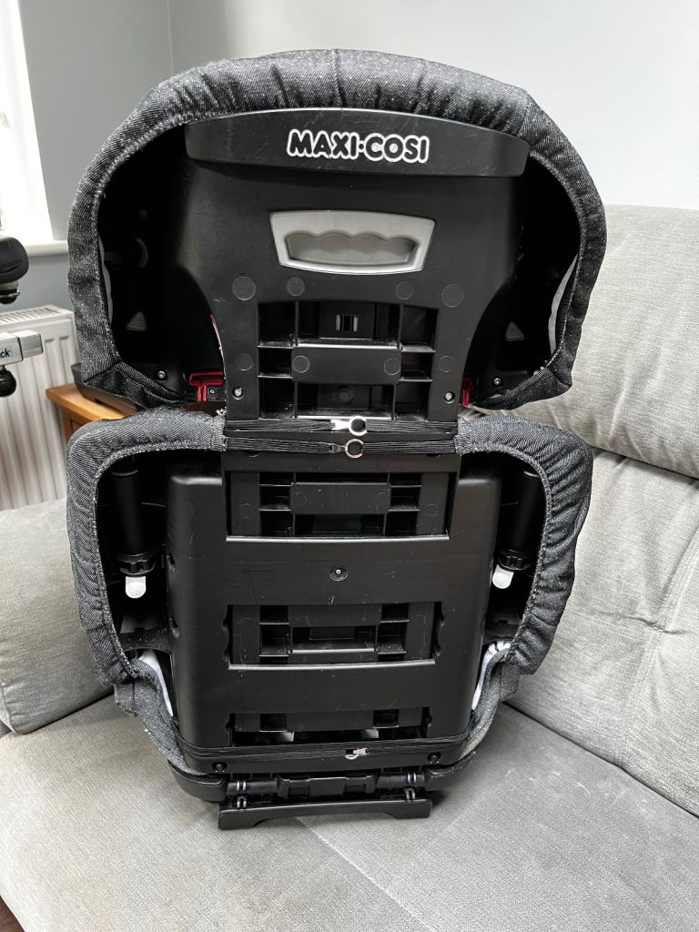 Dark grey Maxi Cosi AirProtect car seat in very good condition. Some staining to bottom cushion and some light scratches to base but otherwise great condition and only light wear and tear. Backrest is easily removable and seat can be used as a booster as the child grows. No extra fixings needed, it’s secured with the seat belt. Covers are removable and machine washable.