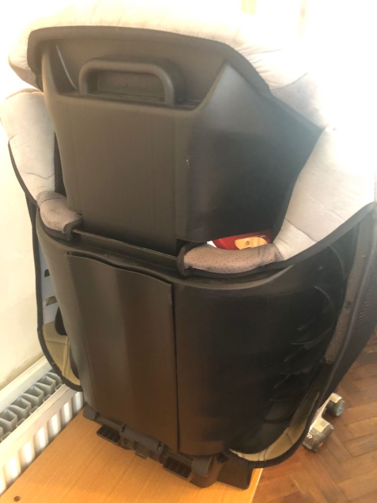 Suitable for a child aged 3/12 and weighing 15/36 kilos. It has built in speakers in the headrest and comes apart to use the base as a booster seat for an older child. It fastens in with any lap and diagonal seatbelt and can be adjusted for a taller child. We had it for our granddaughter and only used it a few times. It has never been in an accident. It is nice and clean and ready for a new child.