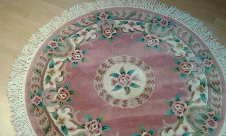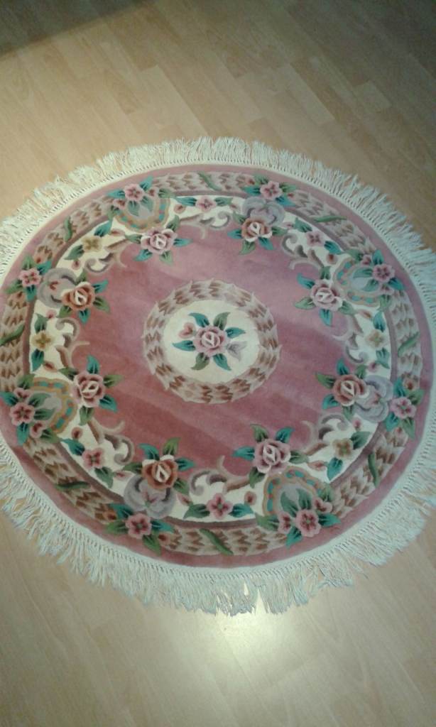 Traditional Chinese circle (1.2m dia) rug in pink/cream/green pattern, hand-tufted from 100% pure wool then hand-carved and finished with a cotton backing. This rug is very luxurious and is around 2cm in thickness, rug is hard-wearing and easy to clean. Excellent condition. First come first served. Collection only and cash only please. £49 ono for quick sale.