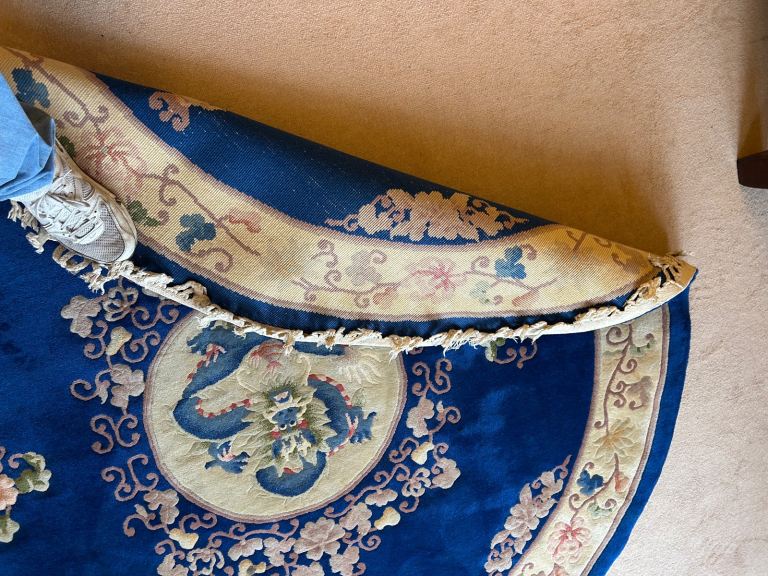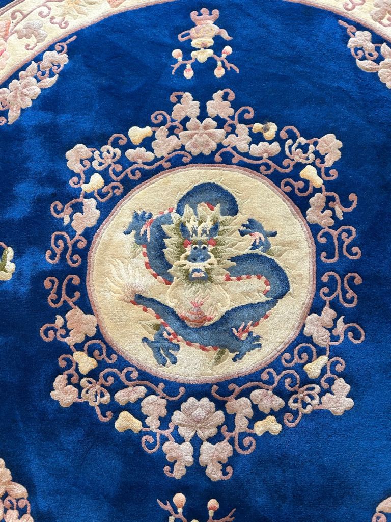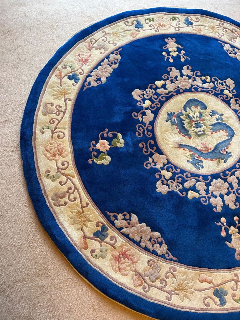 Hand woven oriental carpet with dragon design - 184 cm diameter - has tassels - tucked underneath - see photos