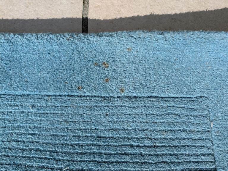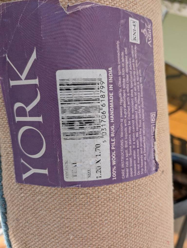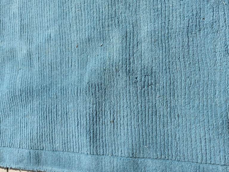 Teal wool rug - a good few years old and it shows - been in loft for quite a while. See pics, in need of tlc - think it came from John Lewis - marked as per photos -dimensions see the label photo - far from perfect