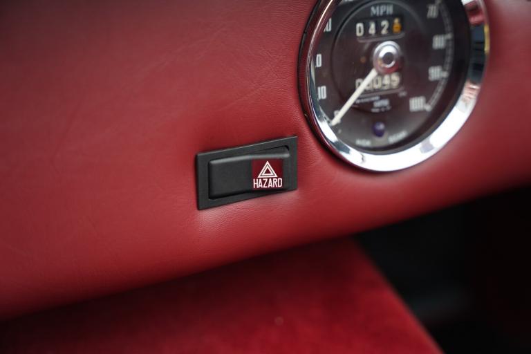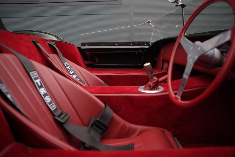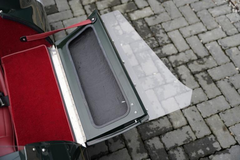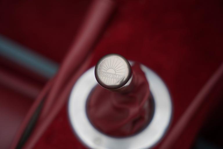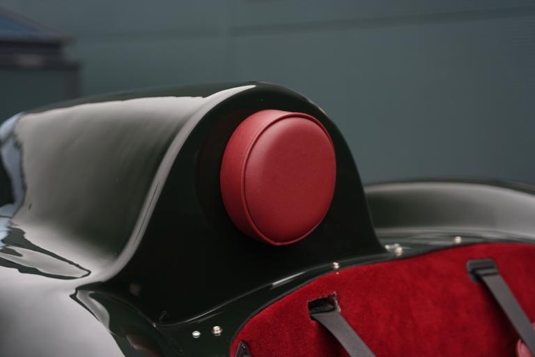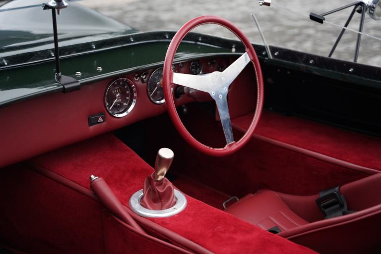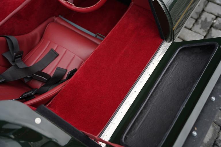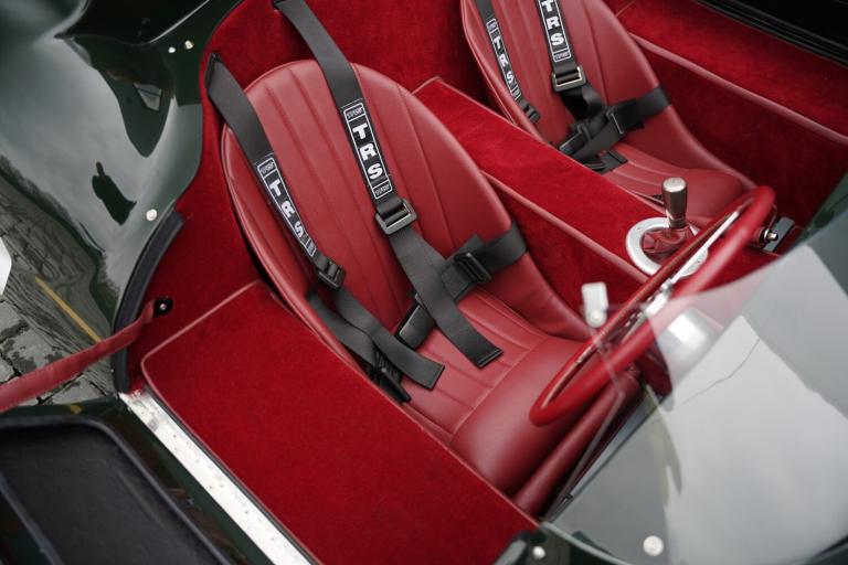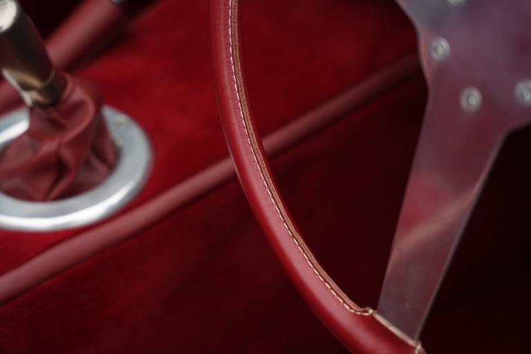 The interior provides a wonderful contrast, with a deep red leather trim and full carpet set. The slim steering wheel is trimmed in the same leather, with a white contrast stitch. The interior remains simple and features a basic gauge set and the switches required for the exterior lighting and equipment. A full tonneau is also supplied.