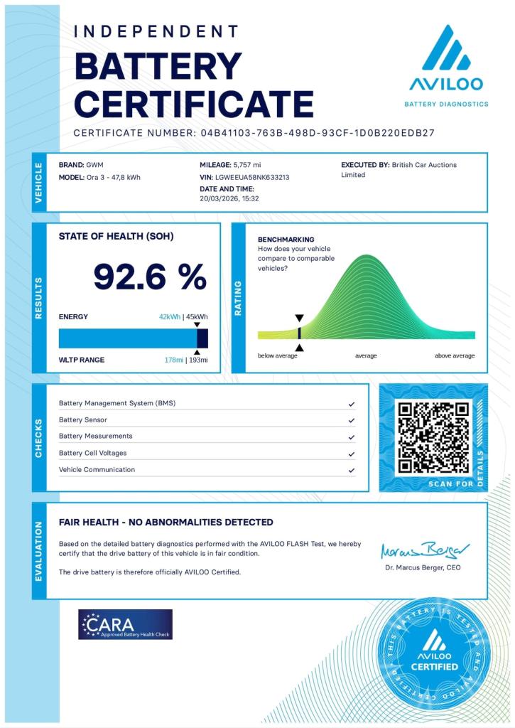 Introducing the Gwm Ora 03 - the ultimate electric hatchback that combines style, performance, and eco-friendliness in one sleek package. Finished in a sophisticated Black exterior, the Gwm Ora 03 is sure to turn heads wherever you go. But it's not just about looks - this electric auto packs a punch with 171 ps of power, ensuring a smooth and exhilarating driving experience every time you step behind the wheel.Don't miss out on the opportunity to own this top-of-the-line Gwm Ora 03. With its impressive mileage, single ownership history, and striking Black finish, this hatchback is the perfect choice for those who want to make a statement on the road. Upgrade to the future of driving with the Gwm Ora 03 today.Competitive finance is also available.We are open 7 days a week and have more than 1500 cars to choose from.All our Euro 4 Petrol and Euro 6 Diesel vehicles meet the ULEZ standard.Vehicle specification can be found below. From time to time vehicles have manufacturer recalls notified. Please read our recall policy on our website for further information. Please be advised that the advertised electric vehicle (EV) listings may experience battery degradation over time, resulting in reduced performance and range compared to the original specifications. Factors such as usage patterns, environmental conditions, and charging practices can contribute to this degradation. While we strive to provide accurate information, the actual battery health and performance of each EV may vary. Customers are encouraged to conduct thorough research and consider the potential impact of battery degradation before making a purchase decision. We recommend consulting with a qualified technician or conducting a battery health inspection for further assessment.Disclaimer: While every effort is made to ensure the accuracy of vehicle specifications, features, and descriptions, errors and omissions may occur. Specifications and equipment may vary and may not be present on the vehicle at the point of sale. Buyers are advised to confirm all details with the seller before completing a purchase.