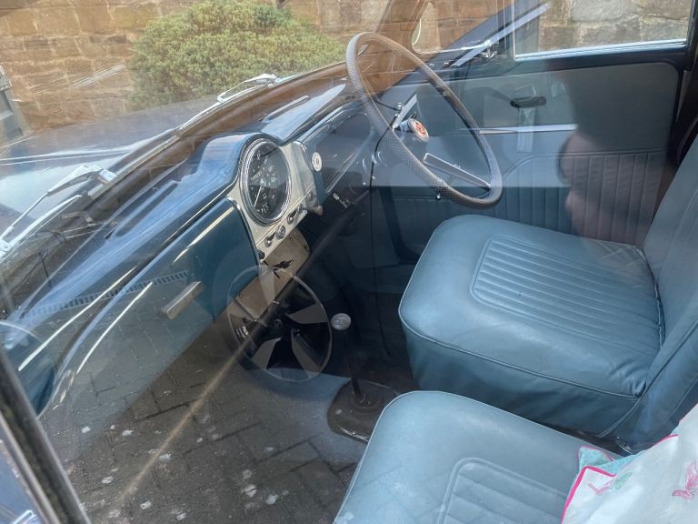 Morris Minor 1000 4 Door, Dark blue Exterior, light blue leather interior.