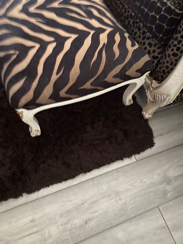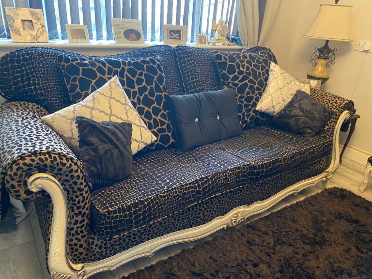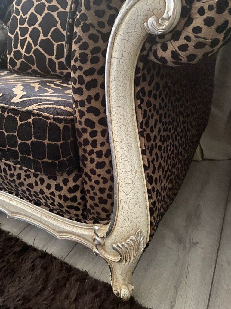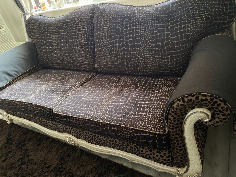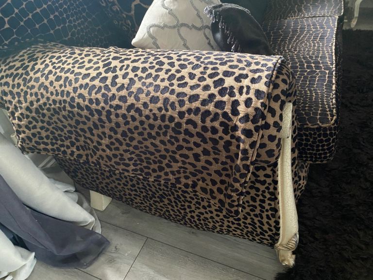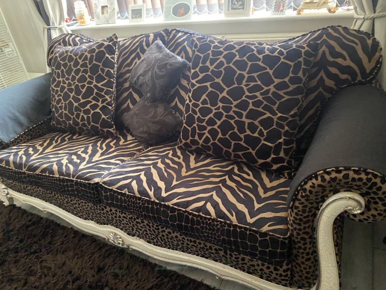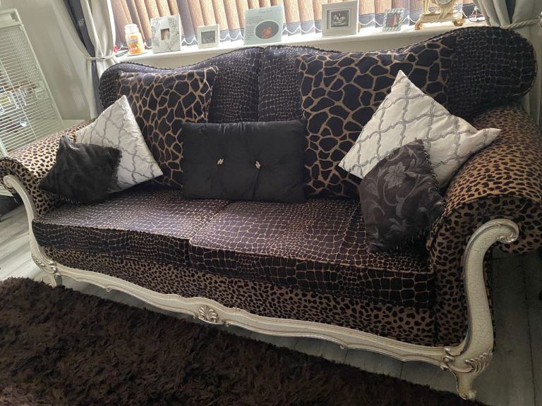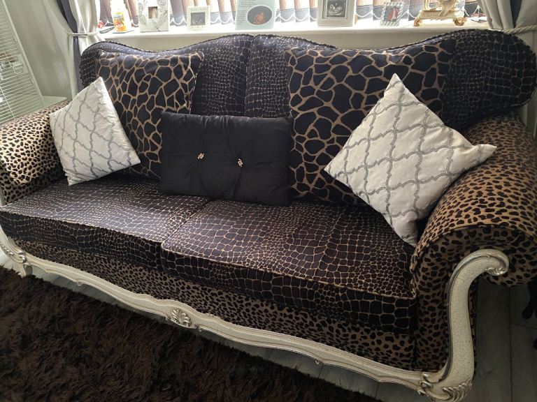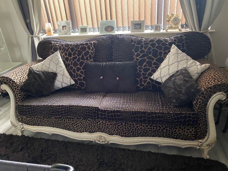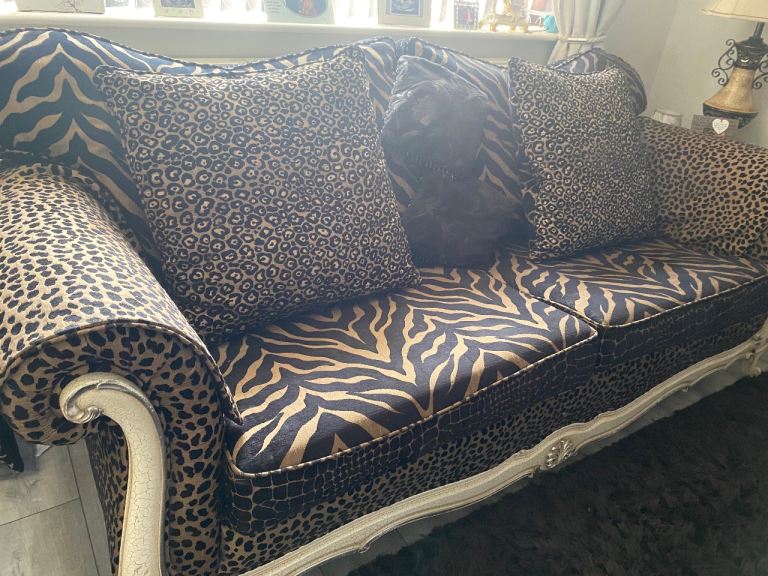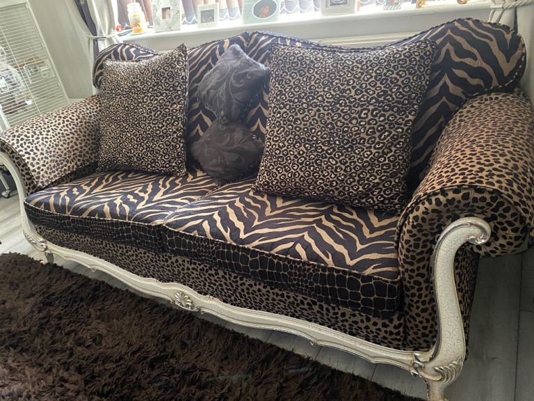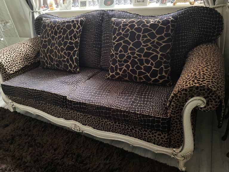 3 seater sofa & footstool in a gorgeous thick animal print fabric, 2 large back scatter cushions with zips & 2 large arm protectors in same print. Very comfortable & well made sofa. Cash on collection only. Thank you for looking.