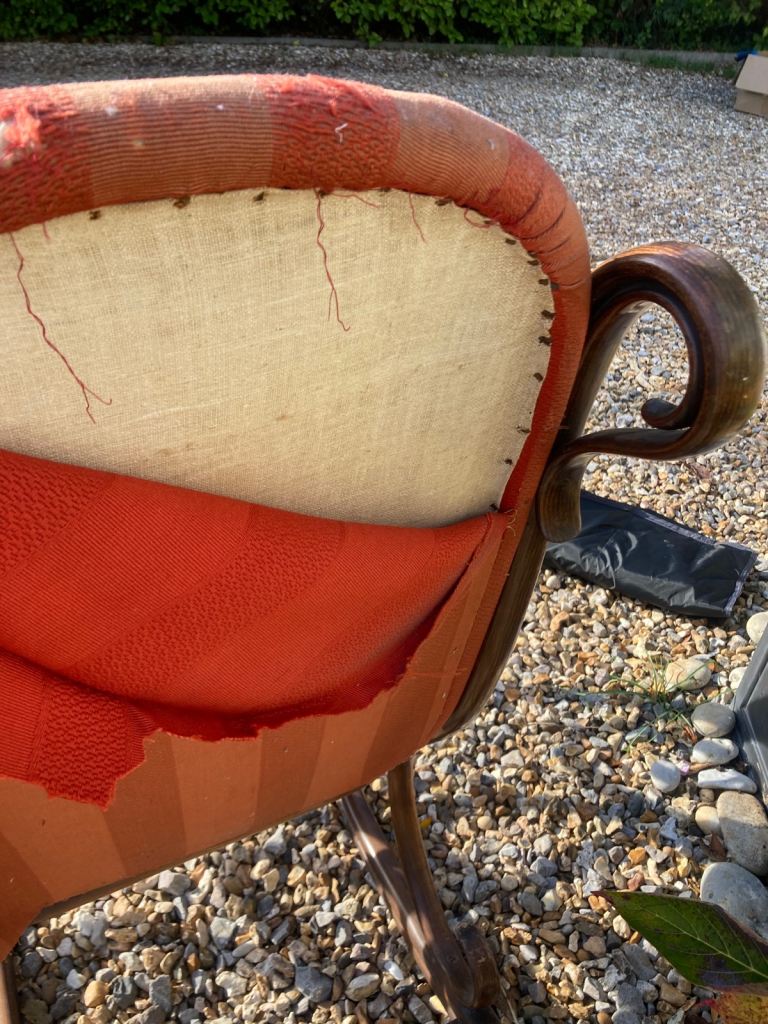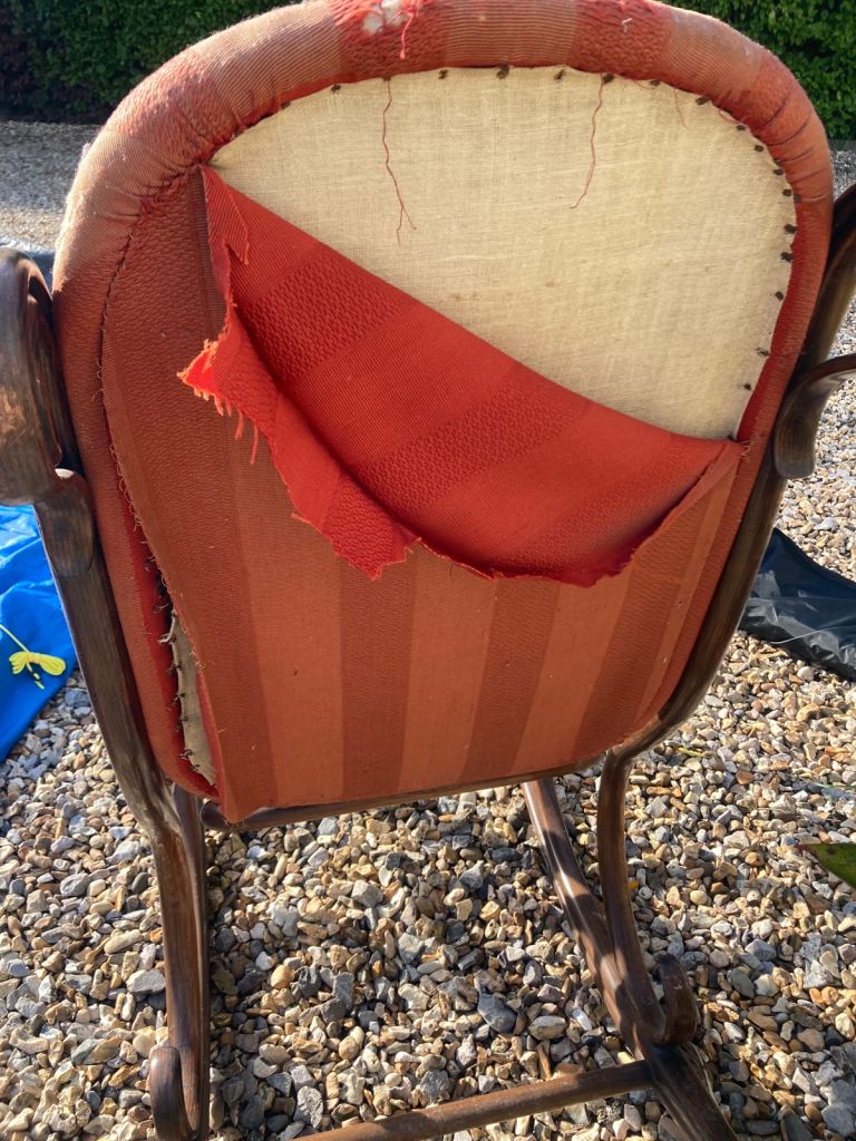 A restoration dream - A stained Bentwood Rocking Armchair. First half of 20Th Century, after the design by Thonet, with padded back and seat above the original base.
