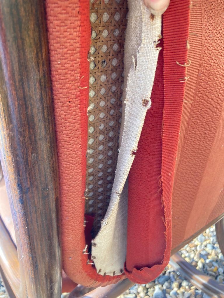 109 cm high. The photos show that once the added padding is removed the original seat and backing ratten is still there. I have not removed all the padding so I do not know if it’s fully intact. It is very comfortable and rocks brilliantly.