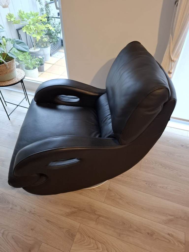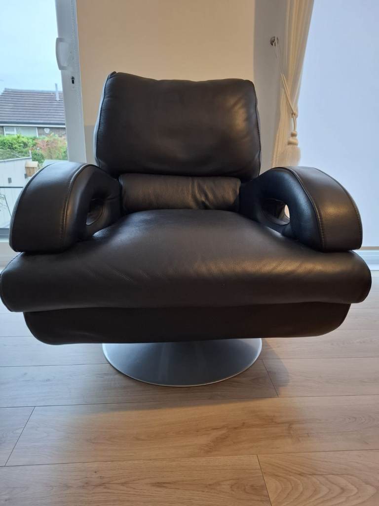 Hi , please find for sale a very expensive genuine Black Italian leather swivel chair . Beautiful modern lines and fantastic condition. Hardly used from a clean non smoking home . New sofa forces reluctant sale . Swivel bottom detaches so will fit in most hatchbacks so no expensive pick ups or van needed may be able to deliver if not too far away . Cost £700 Accept £140