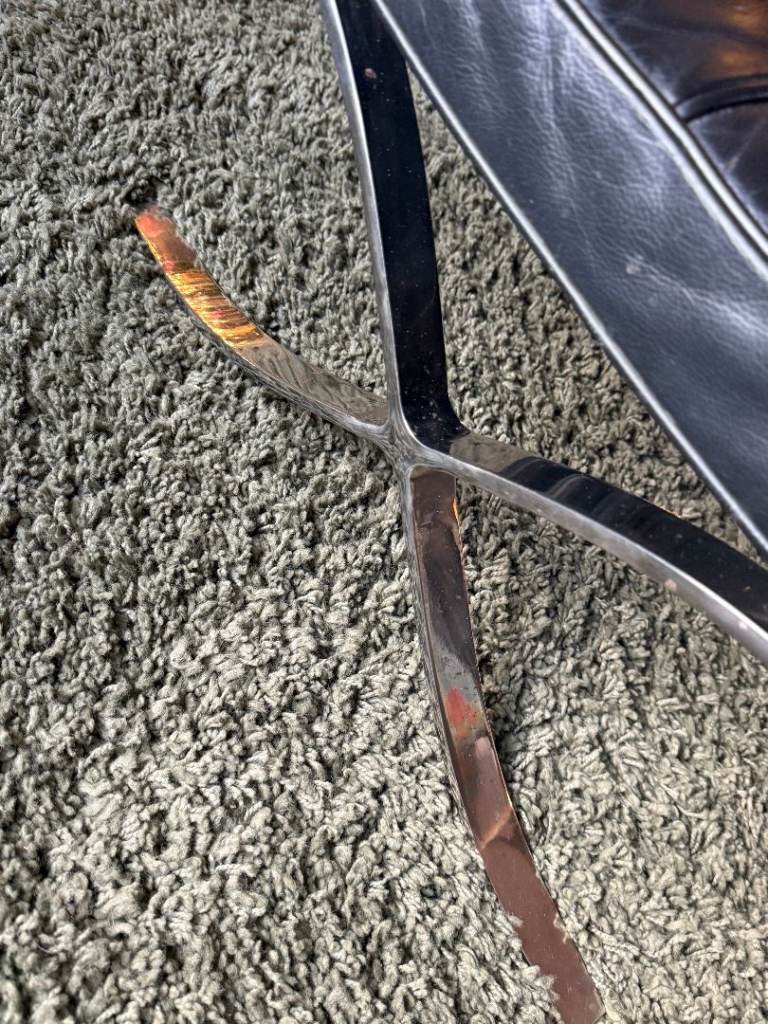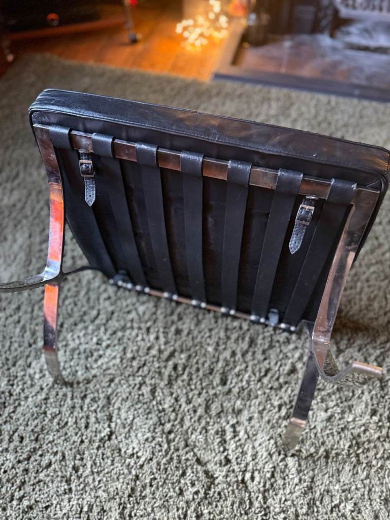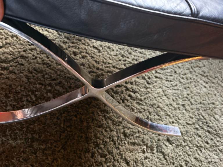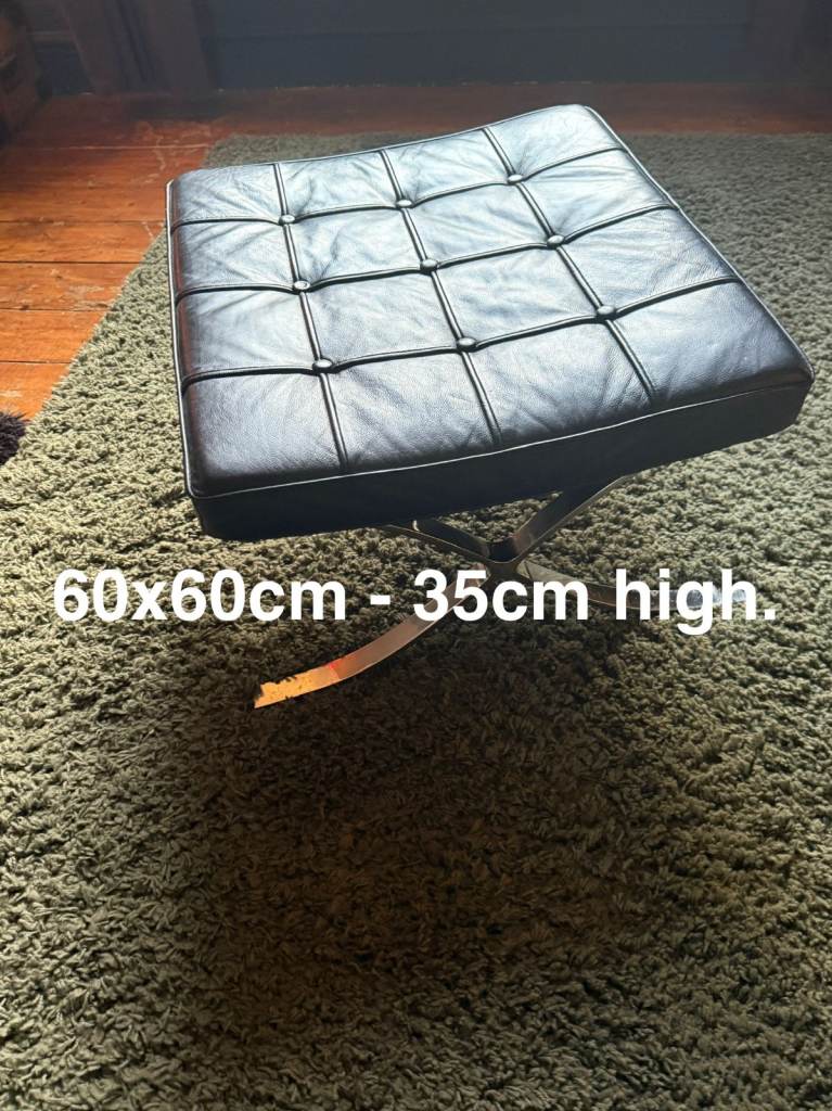 Retro Black Barcelona style foot stool. Leather and chrome - some minor wear and marks - but still a lot of life left in it. Very stylish. 60x60cm x 35cm. Pick up NR2. Heavy piece