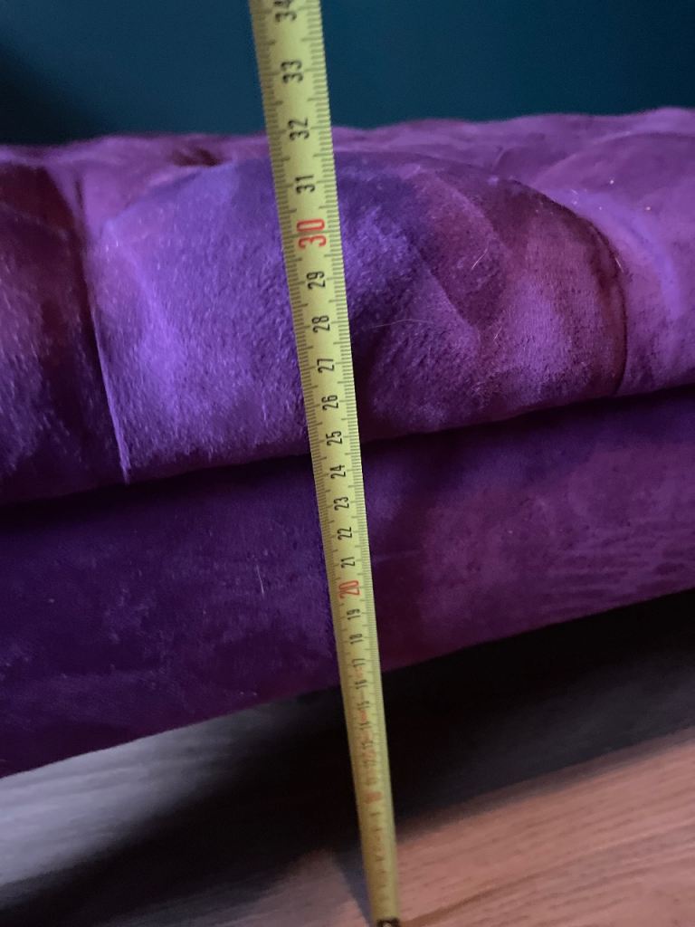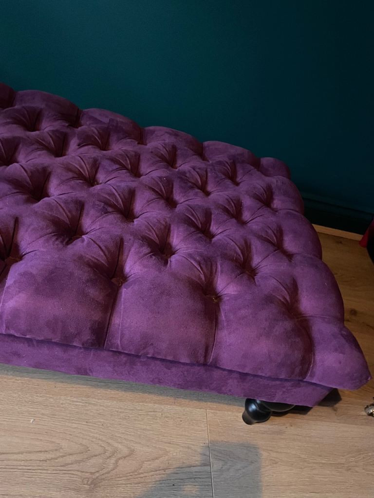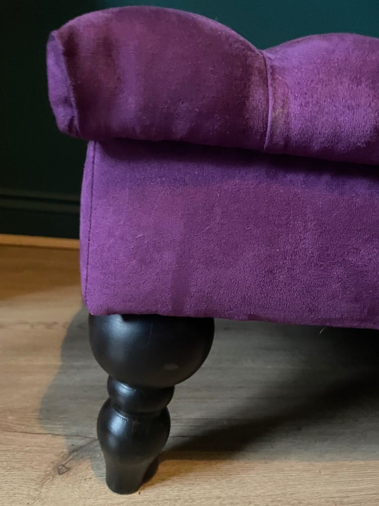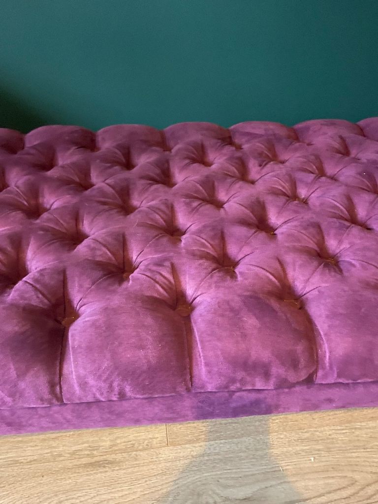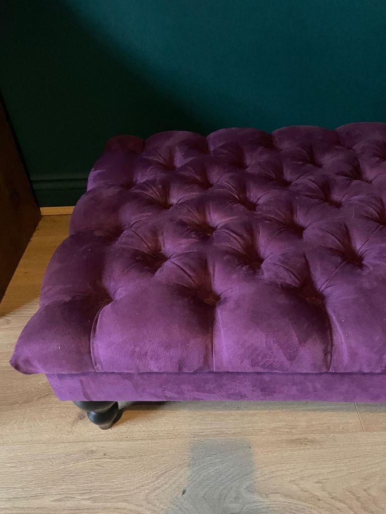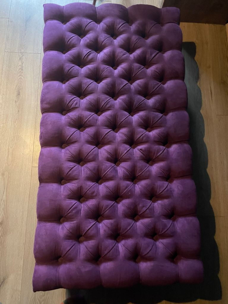 This is a lovely handmade footstool from Etsy. Reluctantly selling due to house move. It measures approximately 115cm wide x 60cm deep x 30cm tall. Fabric is a purple synthetic suede with a velvety feel. The black wooden feed unscrew and fit in a handy compartment underneath the upholstery. Collection from Glossop or can drop of if you’re within a reasonable distance. Thanks!