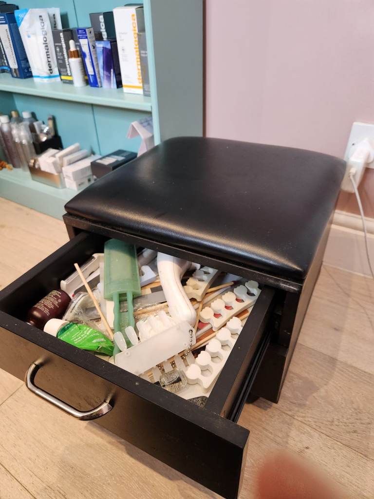 Has 2 drawers to help with supplies and storage. On wheels so it's easy to move around if you need. It's also fun for a girl's room to keep makeup and nail accessories organised. Can also be used as a pedicure massage foot seat for therapist. Or use next to sofa storing controls etc. Selling as no longer needed. Must collect.