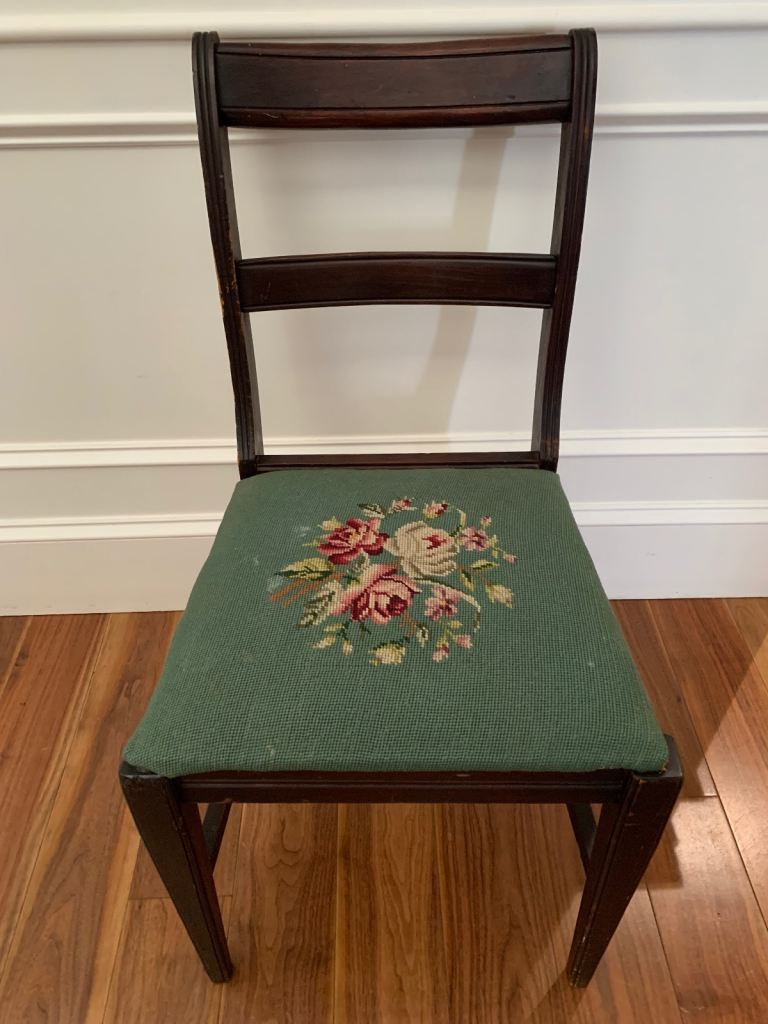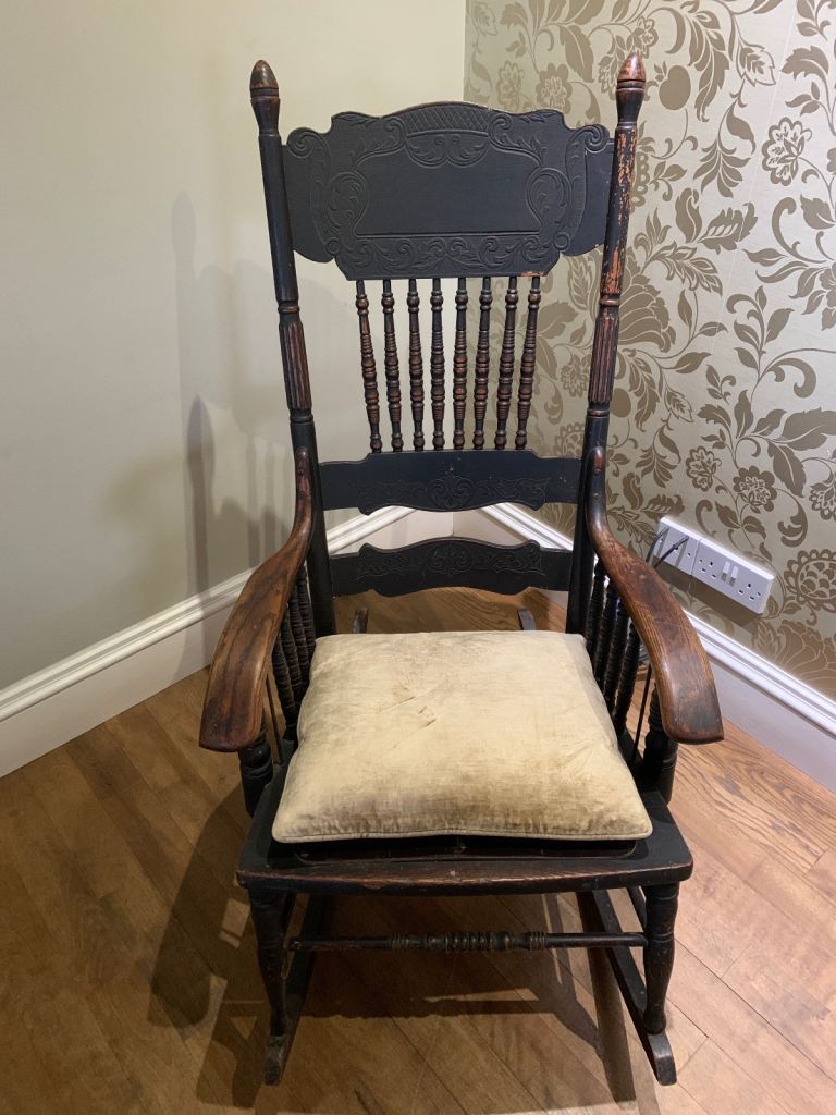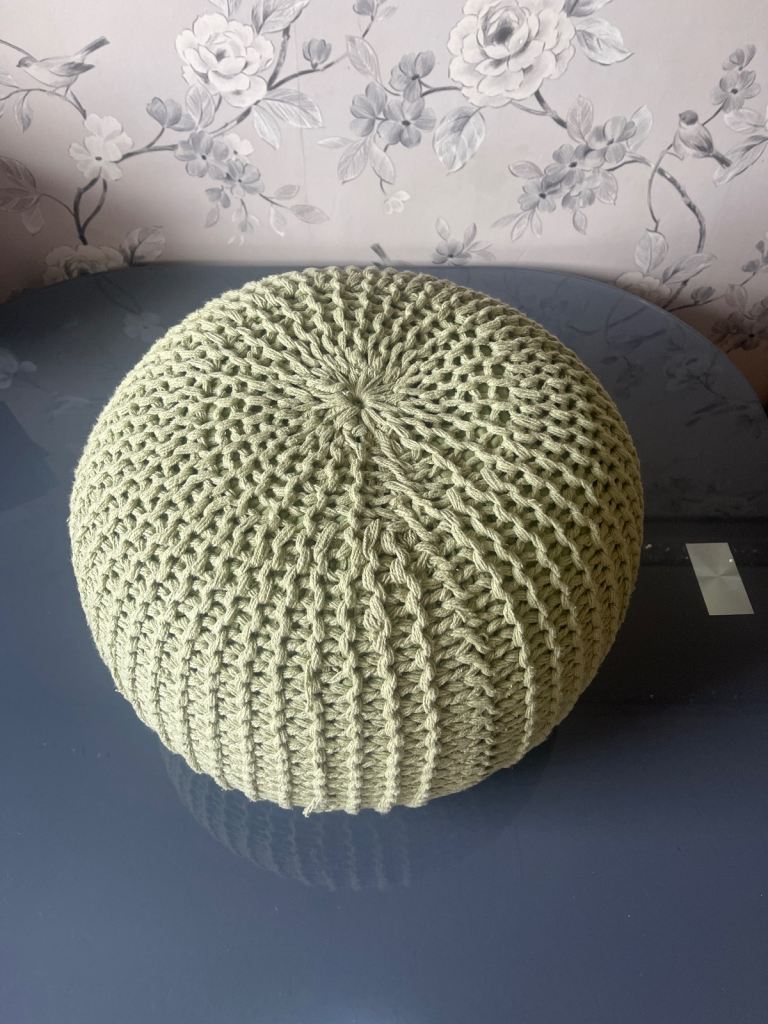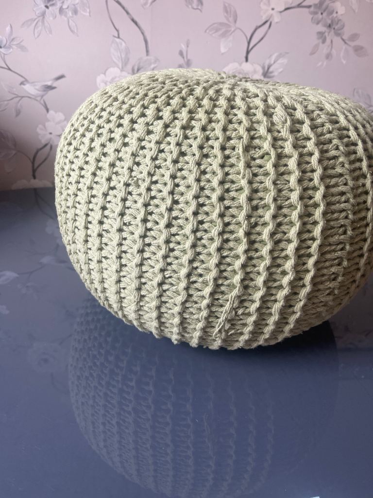 This is a cute footstool/kids beanbag type seat. It’s a sage green colour in a knitted/crochet style.