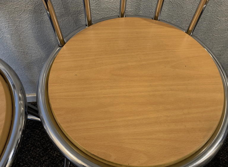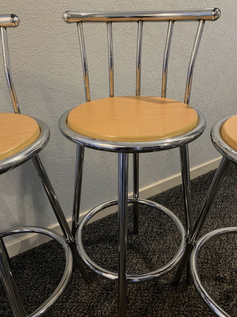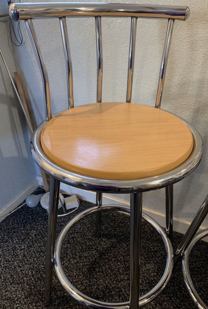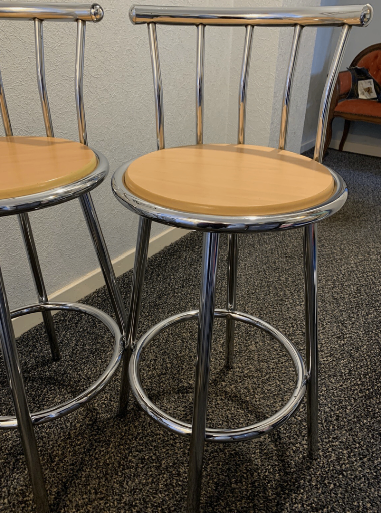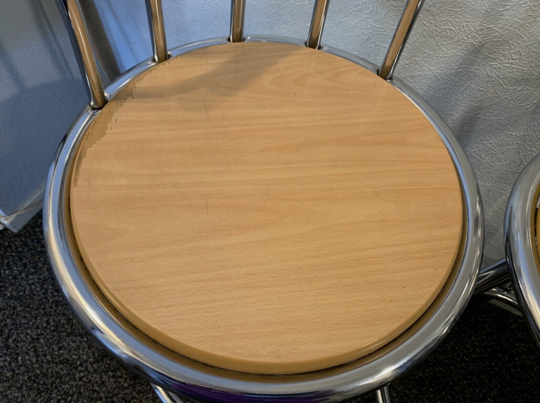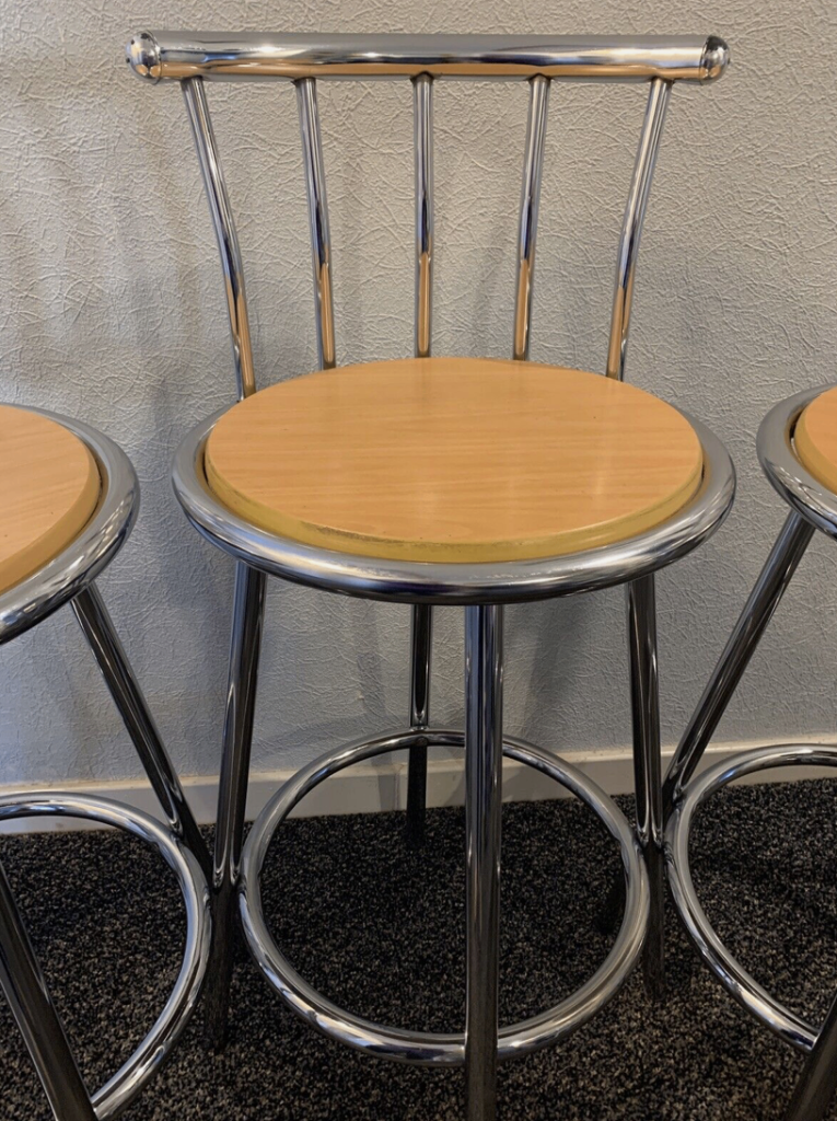 Chrome and Wood Bar Seats. In pretty good condition. Two of the plywood seats had a bit of wear at the front from use but I have turned this to the back as you will see in the photos. The seat height is around 70 cm. Too big to send out by post so collection only I'm afraid. Great value.