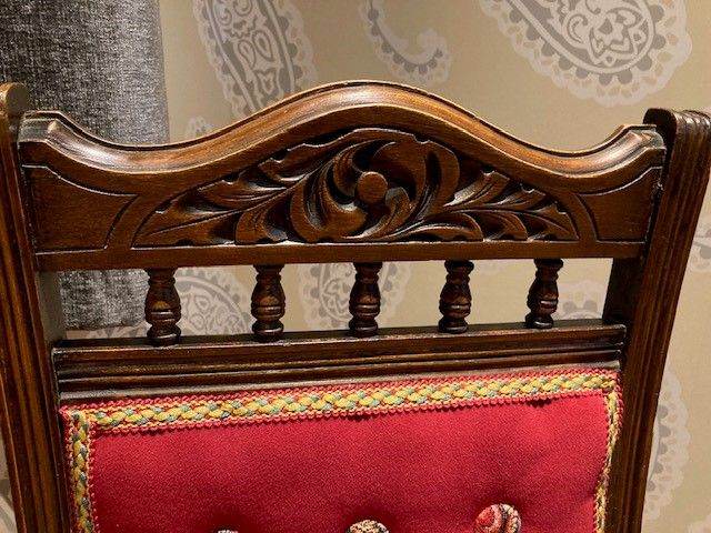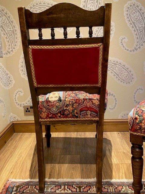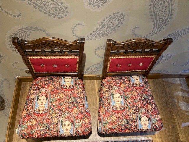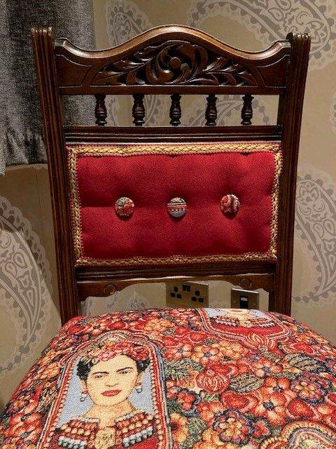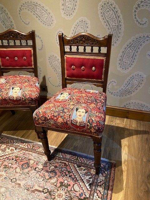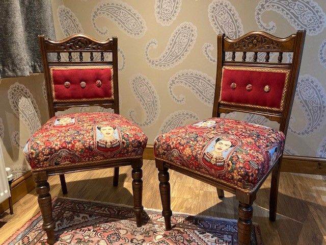 This pair of totally unique dining chairs are original Victorian pieces, with a beautifully carved top back and bobbins in the cross rail. I have completely stripped them back to their original frames, treated the wood completely with woodworm fluid and wood restorer. Then I spent hours at upholstery classes traditionally reupholstering the ‘Frida Twins’, stretching the webbing, lashing in the new springs, regulating the coir, adding wadding and a cotton cover to make the seats deep and supportive to sit on. I also made the contrasting buttons by hand. The vibrantly coloured seat fabric is Frida Kahlo tapestry fabric (cotton, polyester, acrylic). The panels are covered in ‘shiraz’ Cotswold velvet (polyester). They came from Burford Fabrics. The fabulous trim is V.V. Rouleaux ‘raspberry’ braid (French). All fabrics are recommended to be dry cleaned.