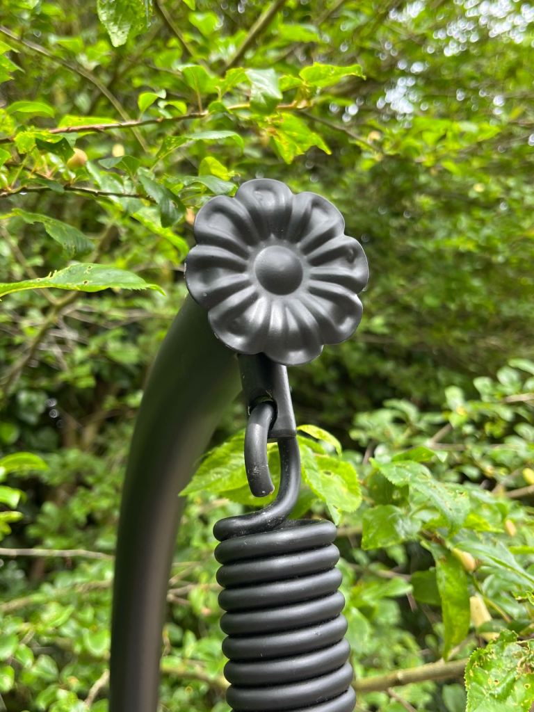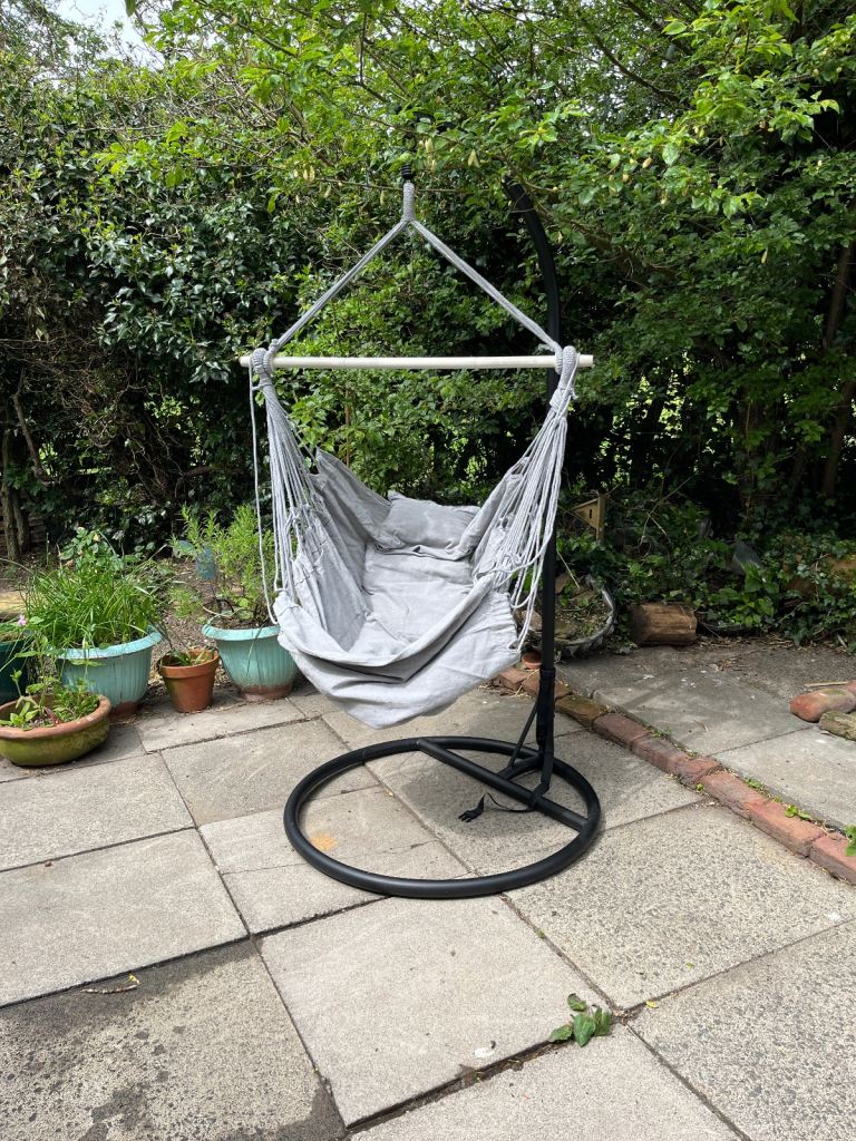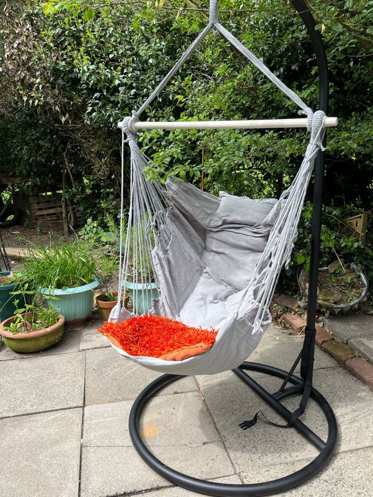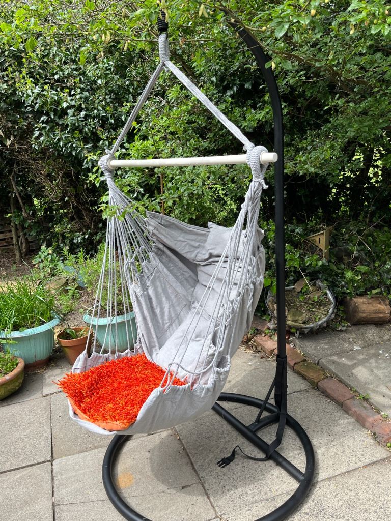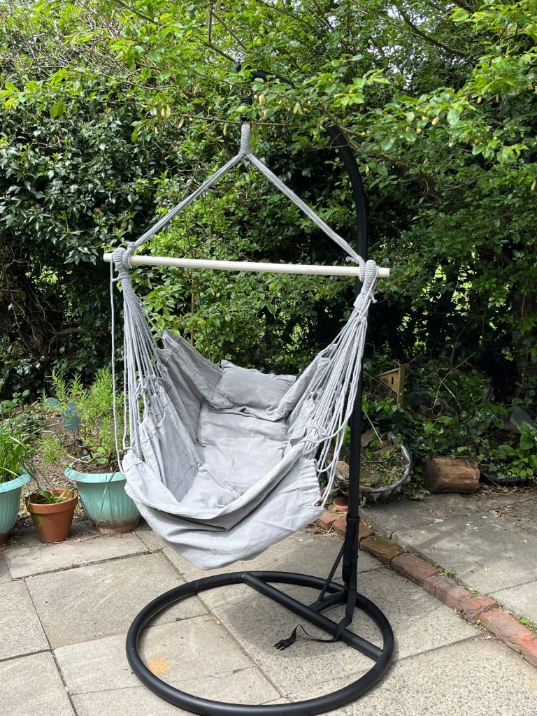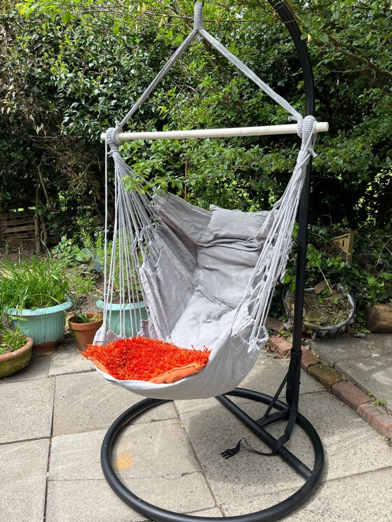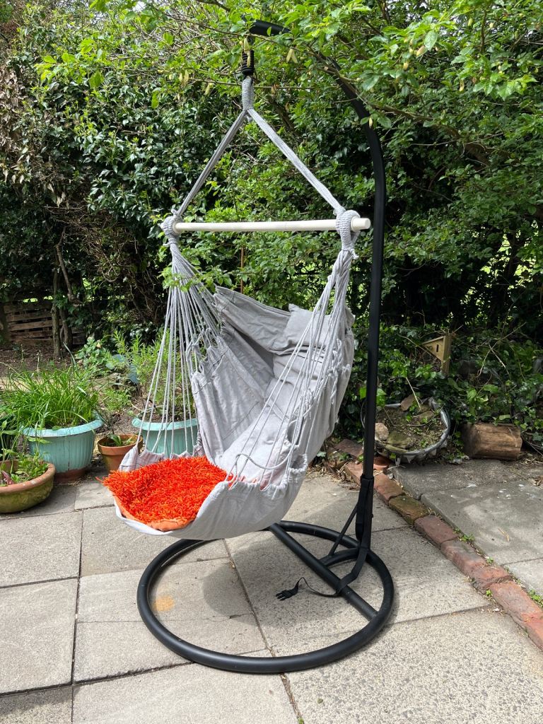 Garden hammock seat swing with metal stand.