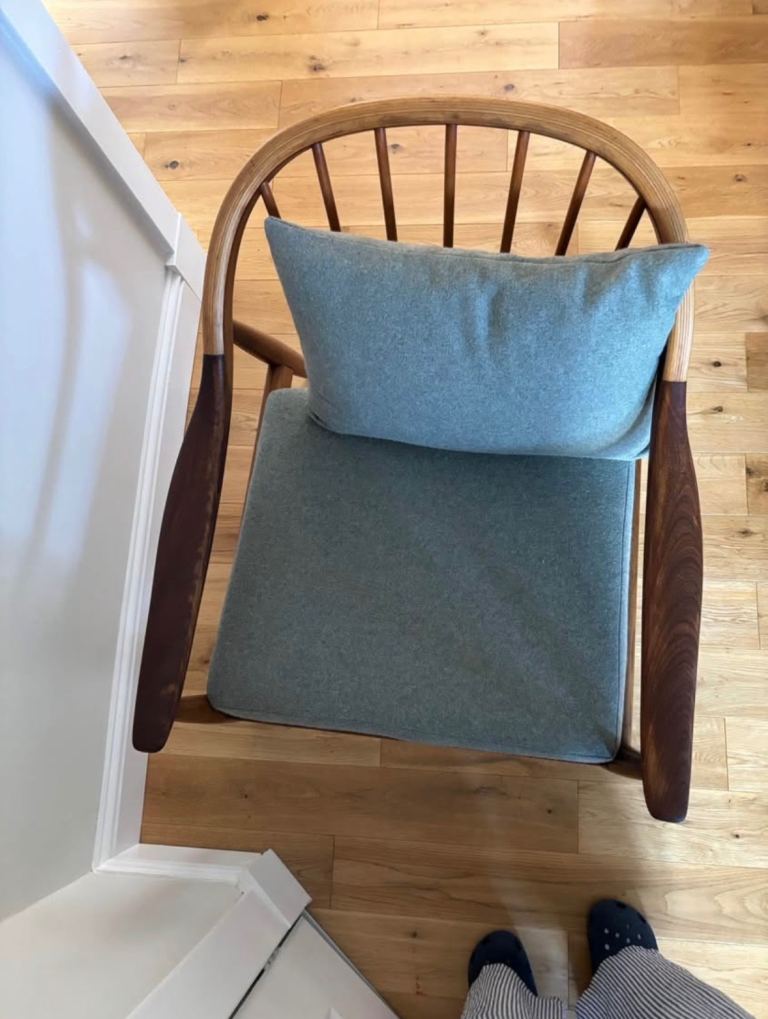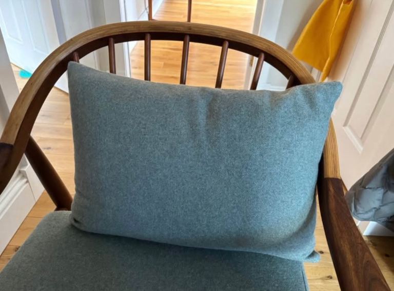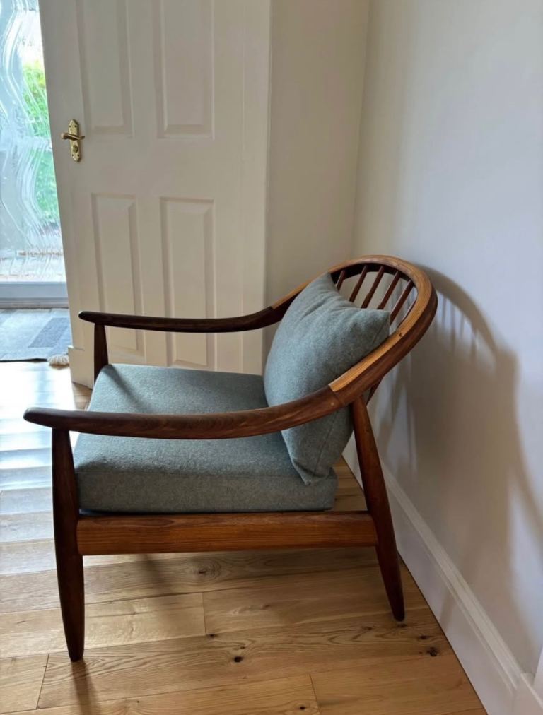Beautiful refurbished Greaves and Thomas Armchair. Wax finish. Seat and cushions replaced in a soft green grey wool from Bute Fabrics. Great condition. It’s a lovely statement piece. Has a couple of small marks due to age and wear.