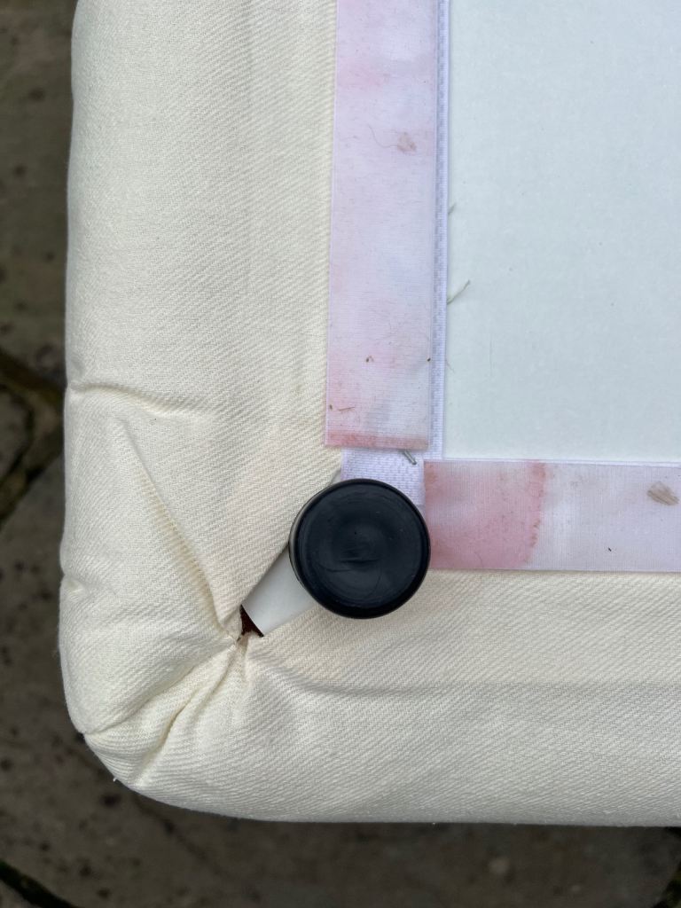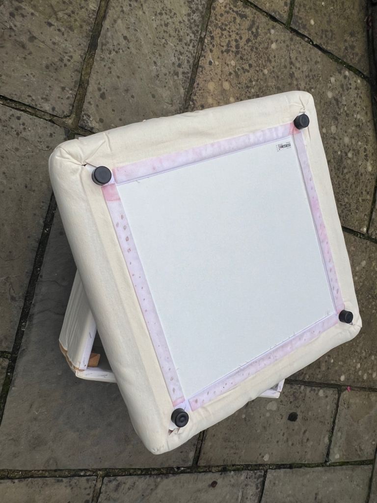 Basic cotton covered so you can upholster it yourself, there is double sided tape/velcro on the underside of the top/lid/cushion