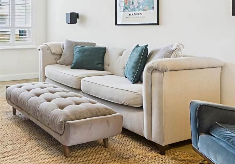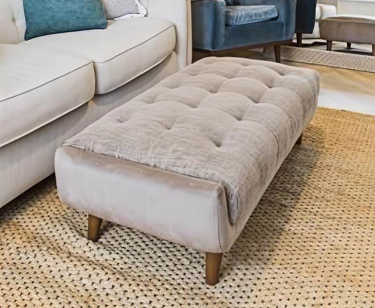 Upholstered footstool in a neutral stone/beige