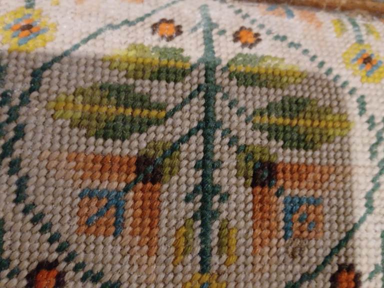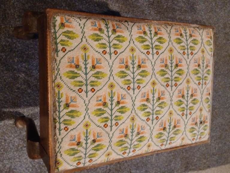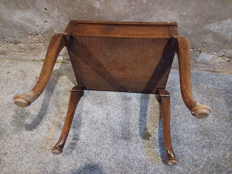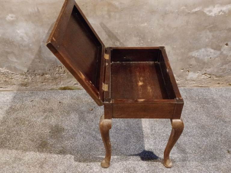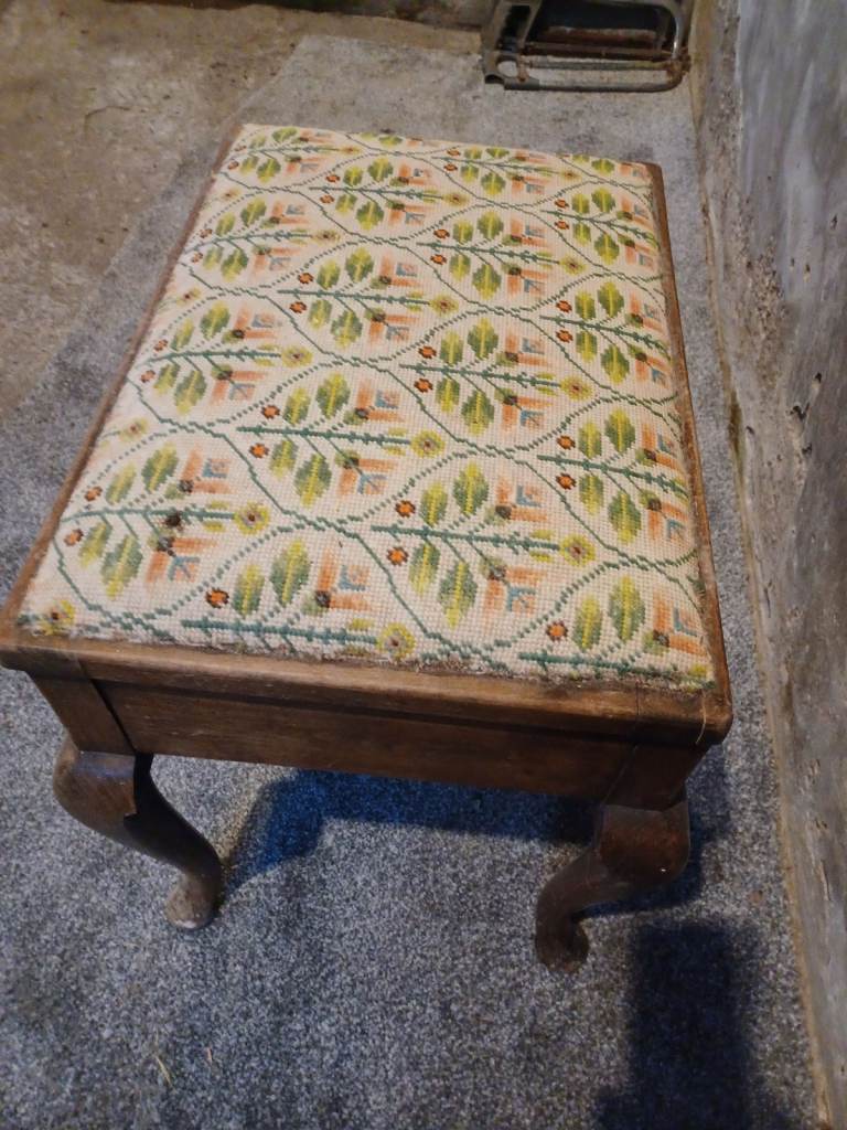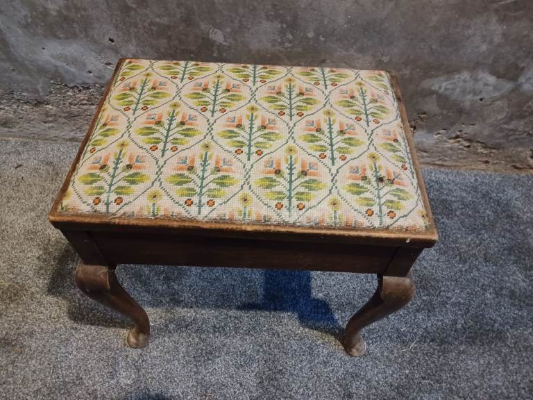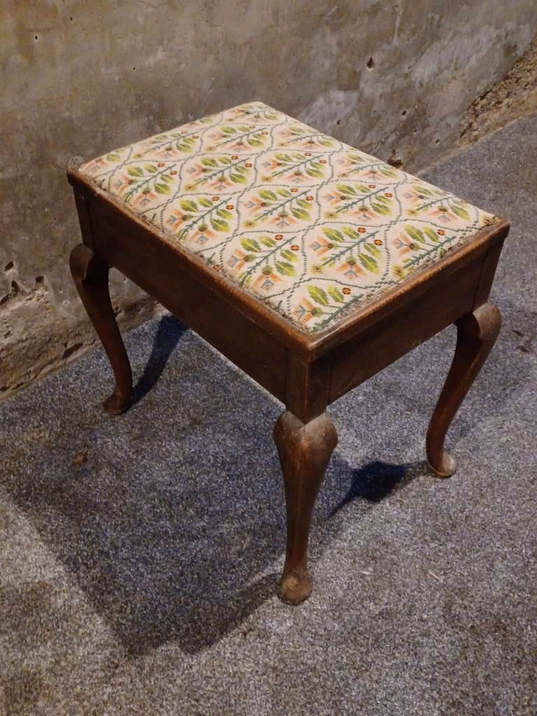 Vintage piano or dressing table stool. This stool has a spacious storage compartment to hold piano music sheets or other paperwork. It has an unique patterned woven cushion cover and regency style legs
