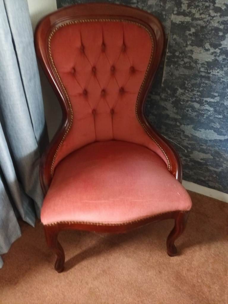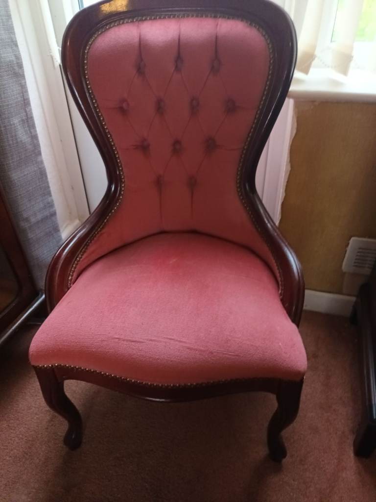 Lovely reproduction dressing chair in pink drylon with pressed buttons very comfy would suit meny uses