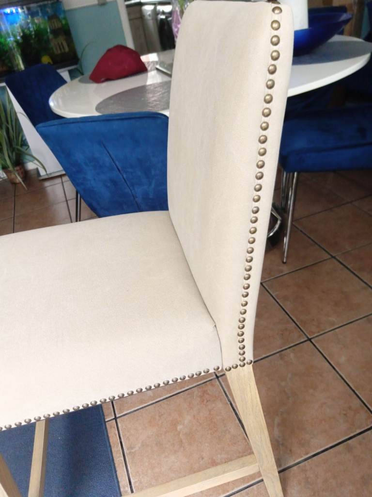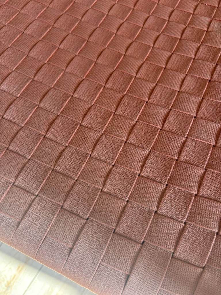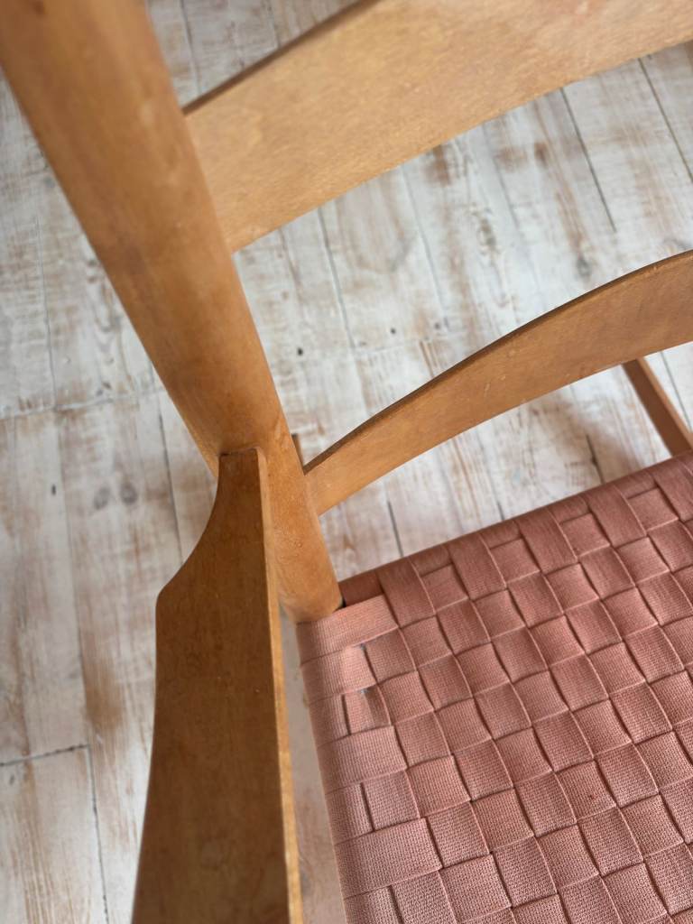 The signature natural canvas woven tape seat is rust orange. The tape is a heavy duty 100% cotton canvas webbing which has been yarn dyed with fade resistance in mind. If you’d like to change the fabric colour these chairs are easily rewoven yourself with tape and instructions available from a variety of UK suppliers.