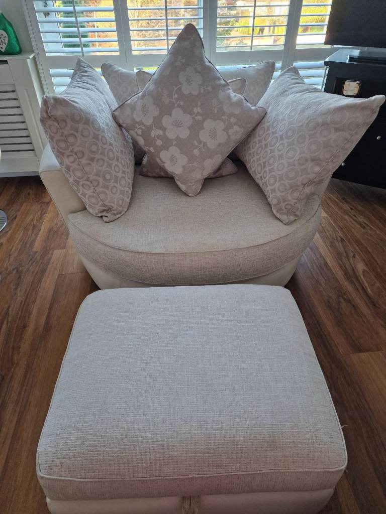 Cream fabric & leather swivel seat H60cm x W139cm x L128cm without seat cushion.with seat cushion 130cm. with 5 scatter cushions.