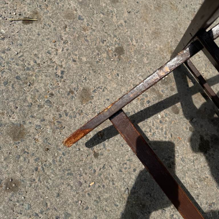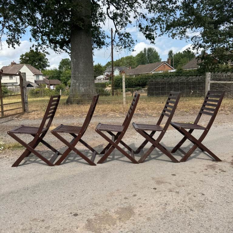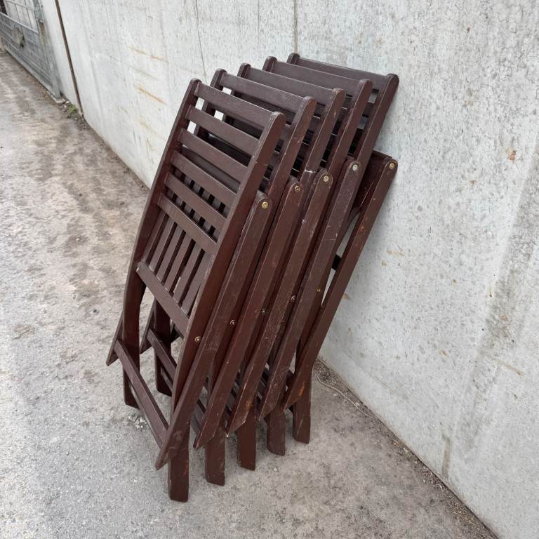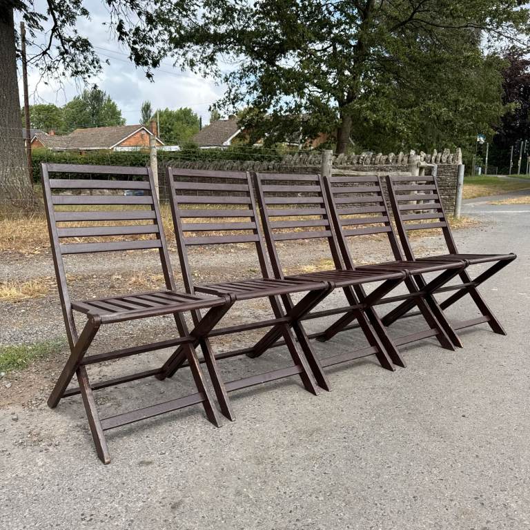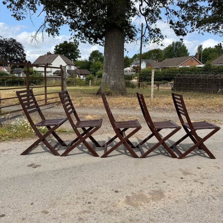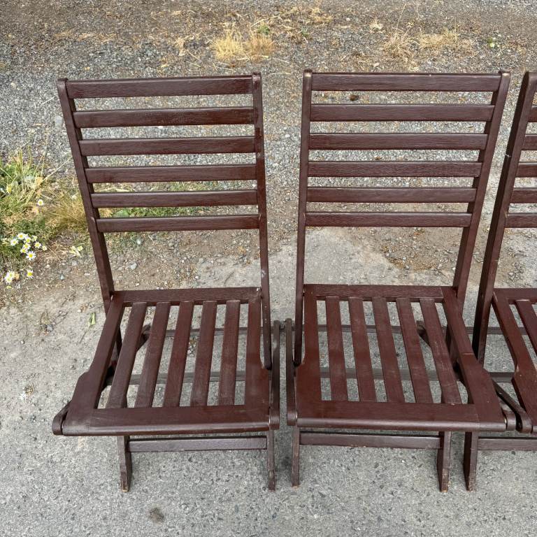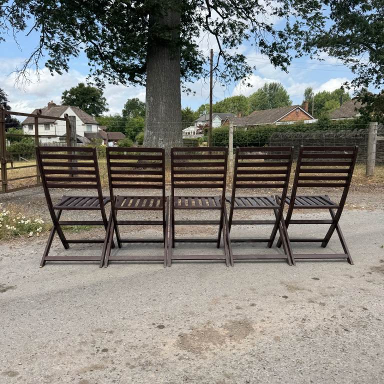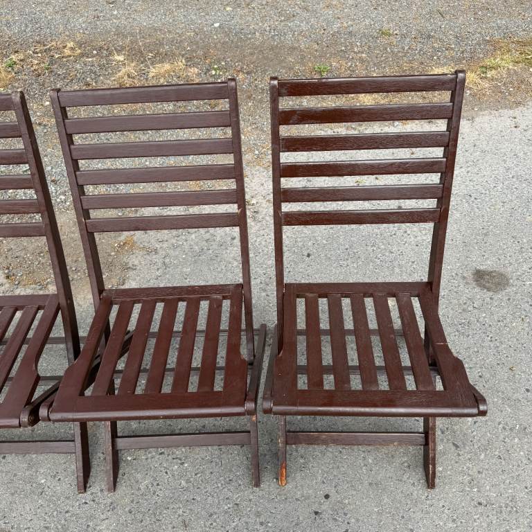 This set of garden chairs is an ideal addition for any garden setting - they are ready for use. They all fold, which is ideal for storage when not in use. They are made of solid teak with a nice grain and painted in a brown colour. There are some marks and scratches throughout as well as some light damage to one leg, however this doesn't affect use. Please see the photos for a full condition.